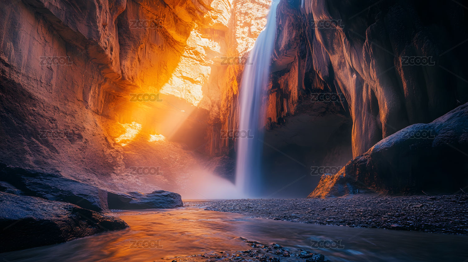 峡谷瀑布金色阳光