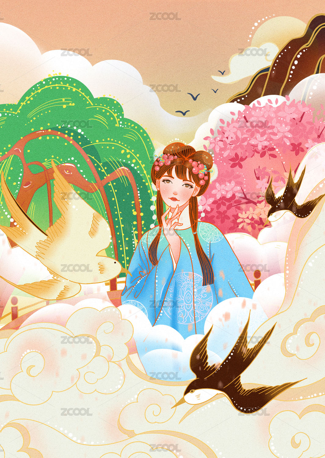 新国风,人物,芙蓉花,仙鹤,梅花鹿,场景,插画