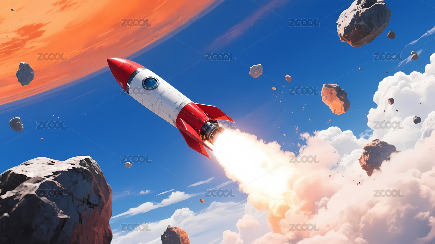 3D卡通火箭穿越云层