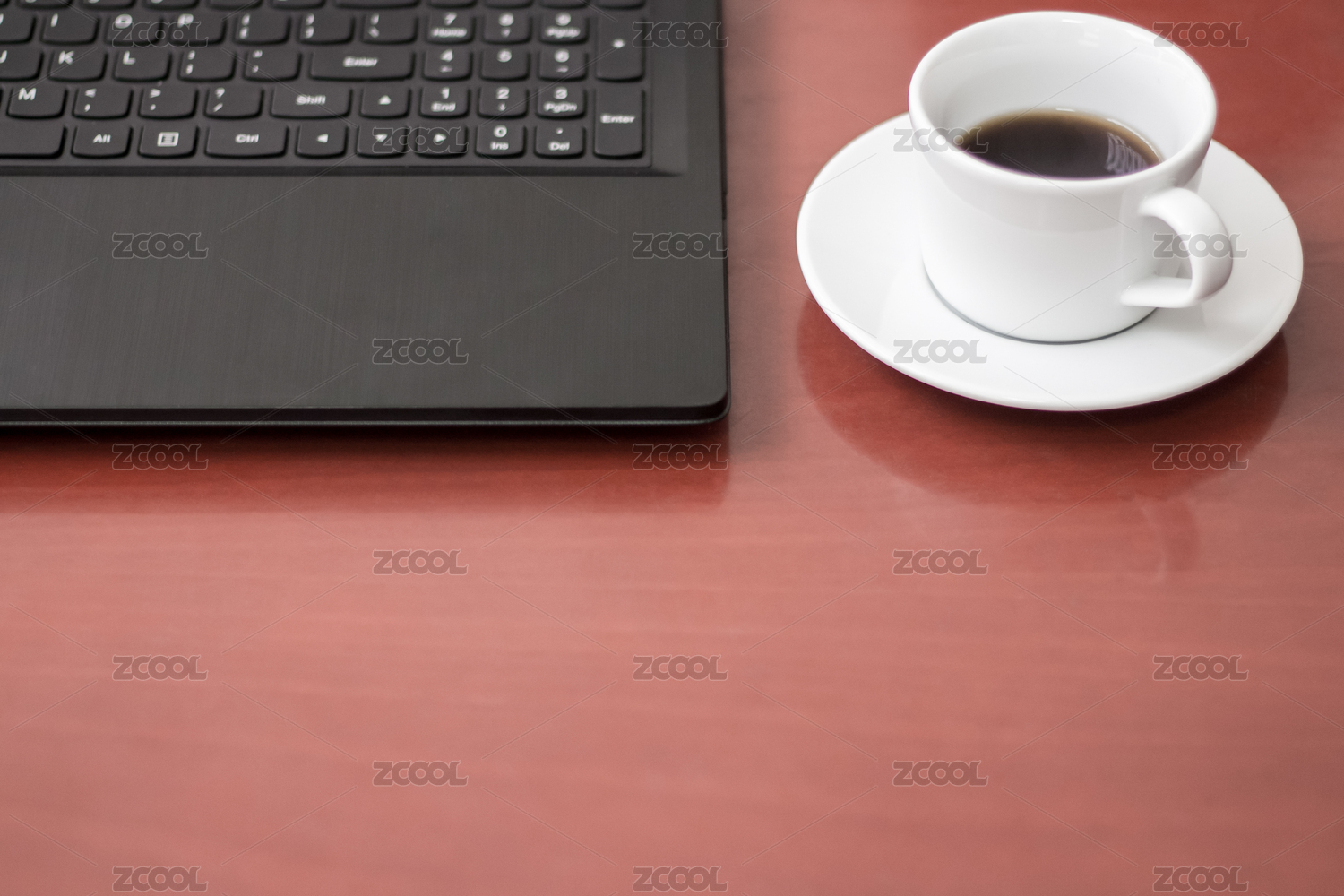 笔记本电脑搭配咖啡杯套装办公桌喝咖啡工作概念