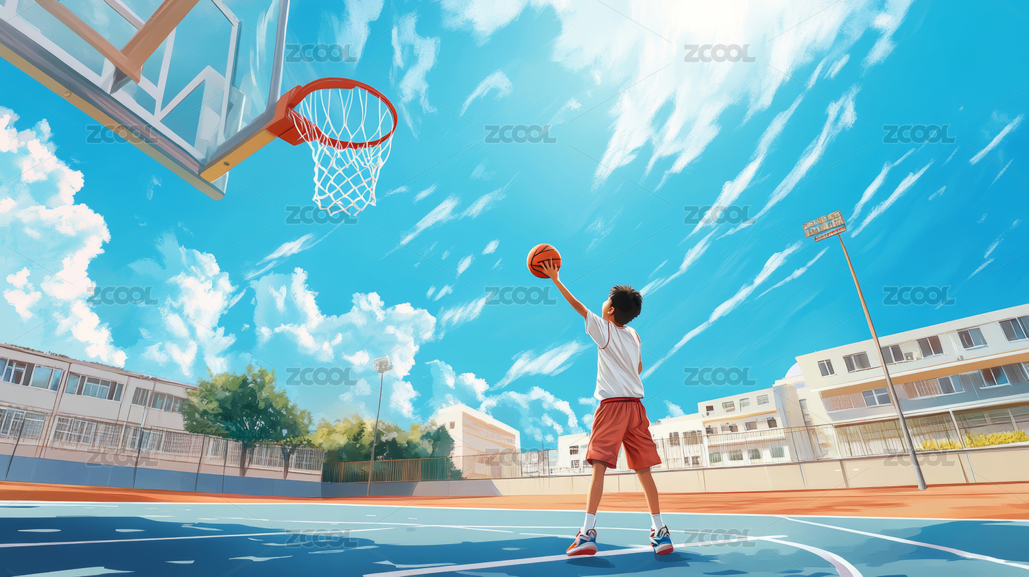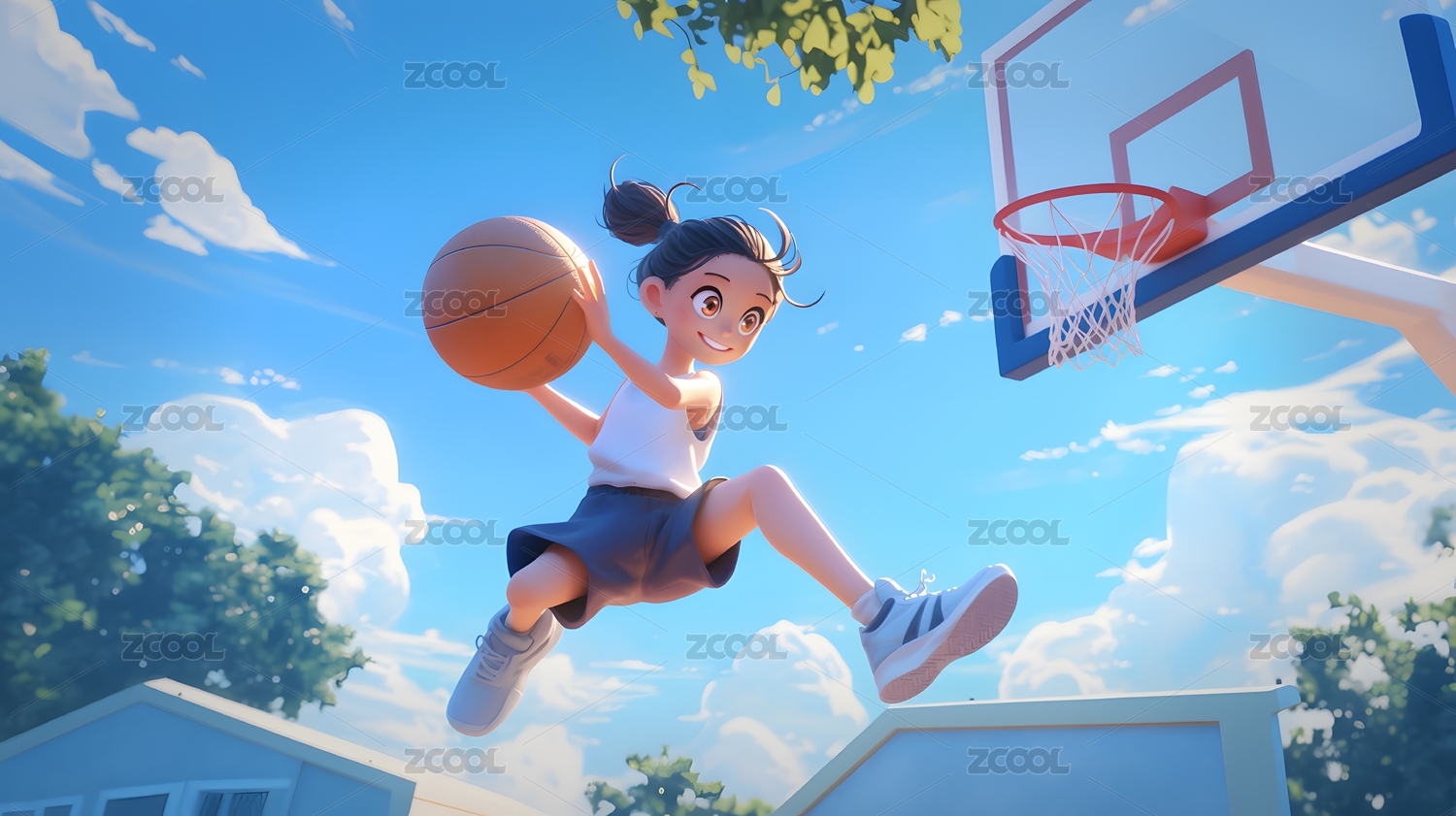 卡通男孩灌篮篮球在蓝天背景