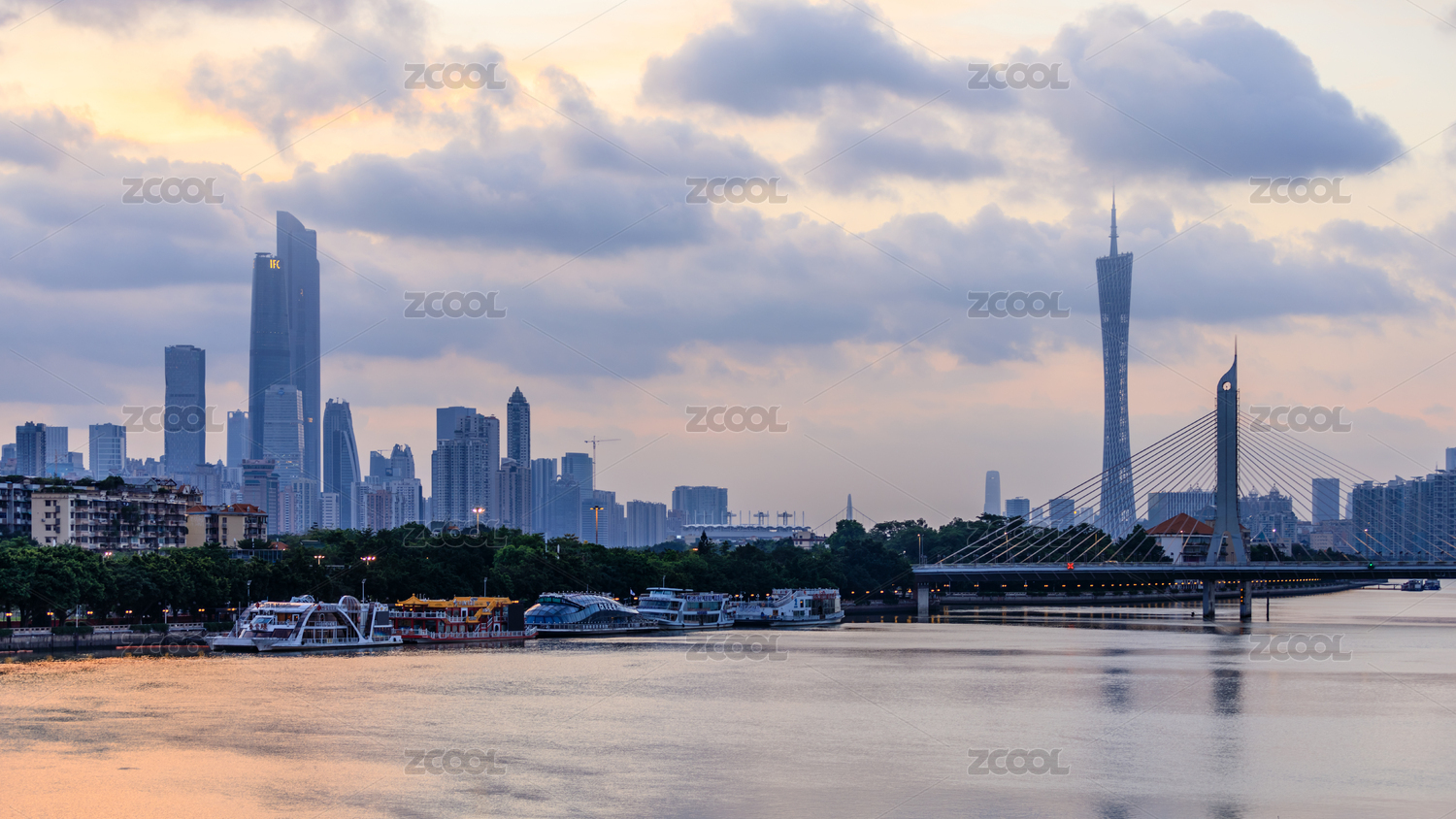 中国广东广州塔和珠江新城海心桥城市天际线日出风光