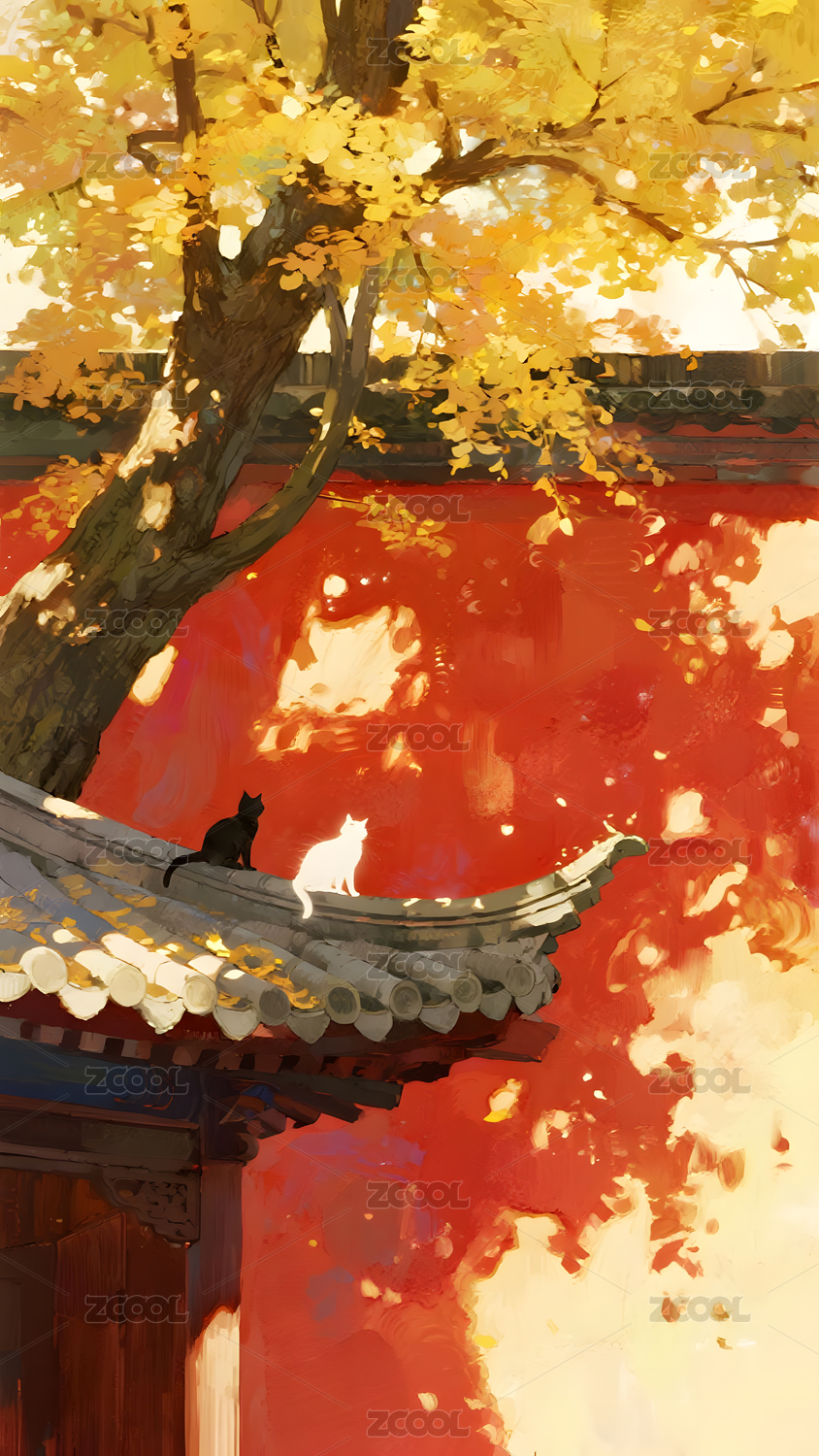 红色中国风宫墙插画,唯美卡通清新秋天美景