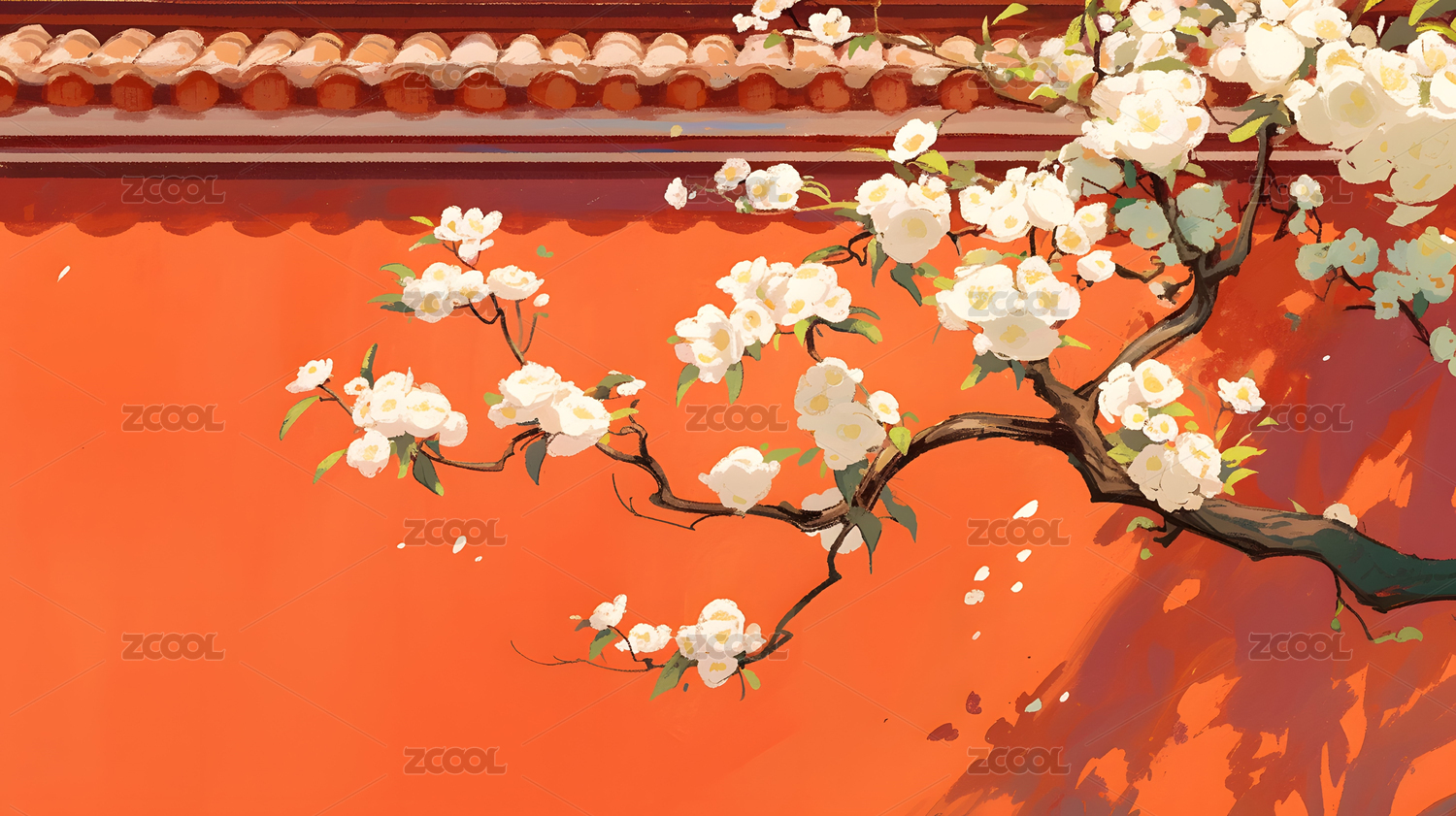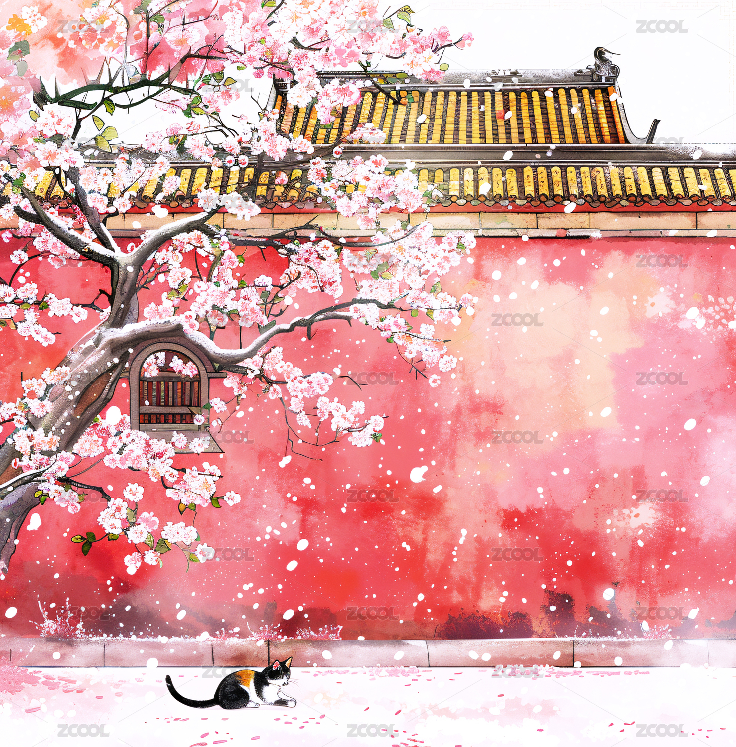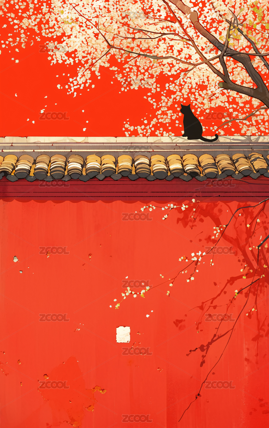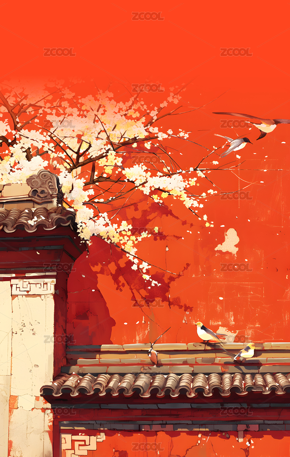 红色,墙,水彩画,中式,国潮,中国风,国风,建筑,古建筑,中式风格