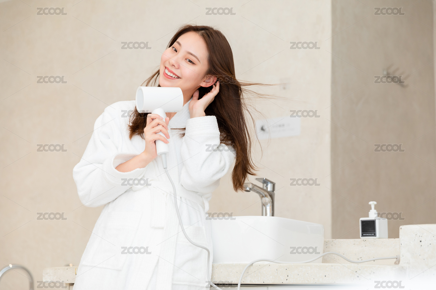 美女,前方,开心,仰拍,微笑,浴袍,沐浴,洗头,吹头发,吹风机