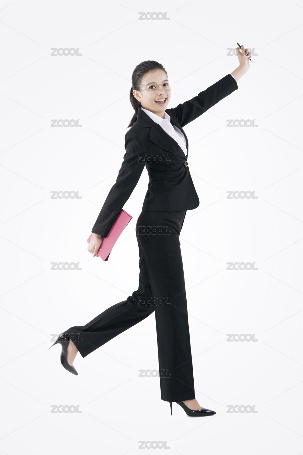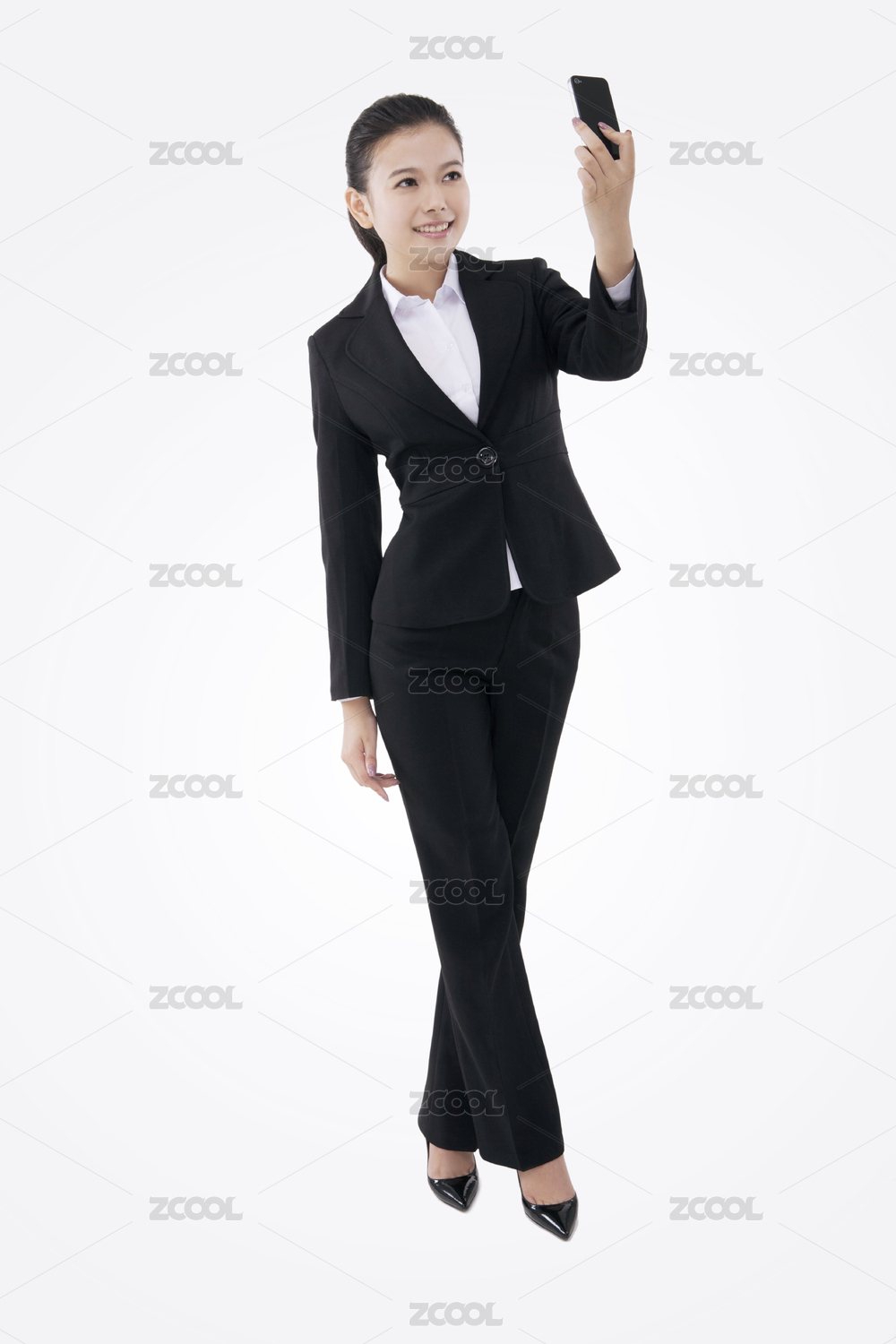 白色背景下穿着黑色短裙拿着手机的商务女性