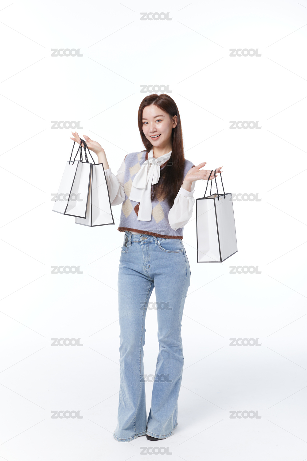 双手提着购物袋的女性全身形象