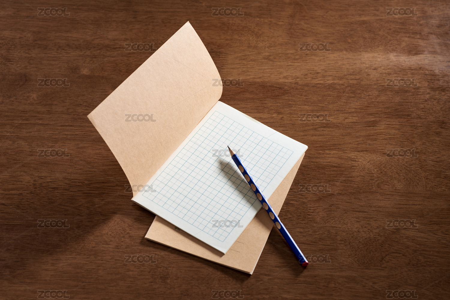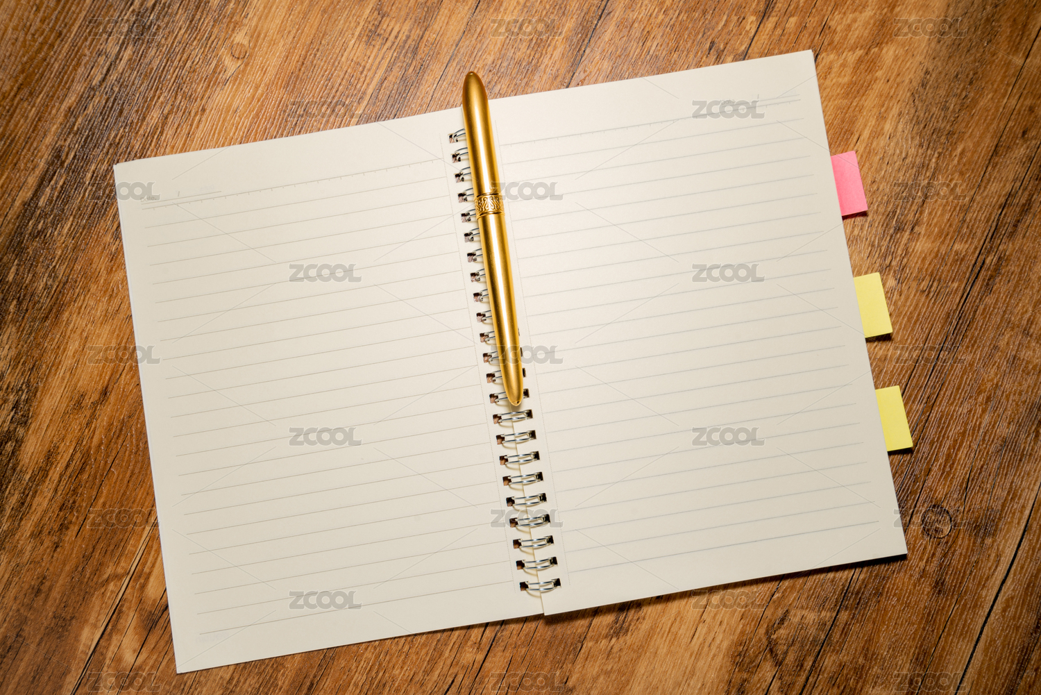 空白的有书签的笔记本放在办公室木制纹理办公桌上搭配金色钢笔学习记笔记概念