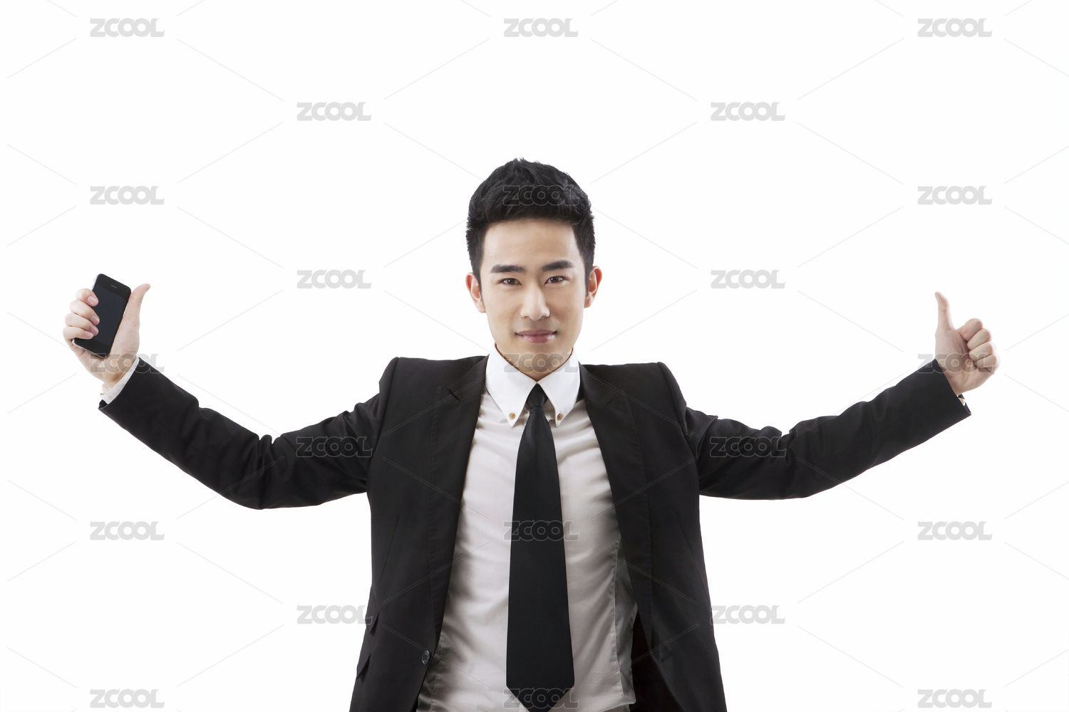 白色背景前敞开双手的商务男性