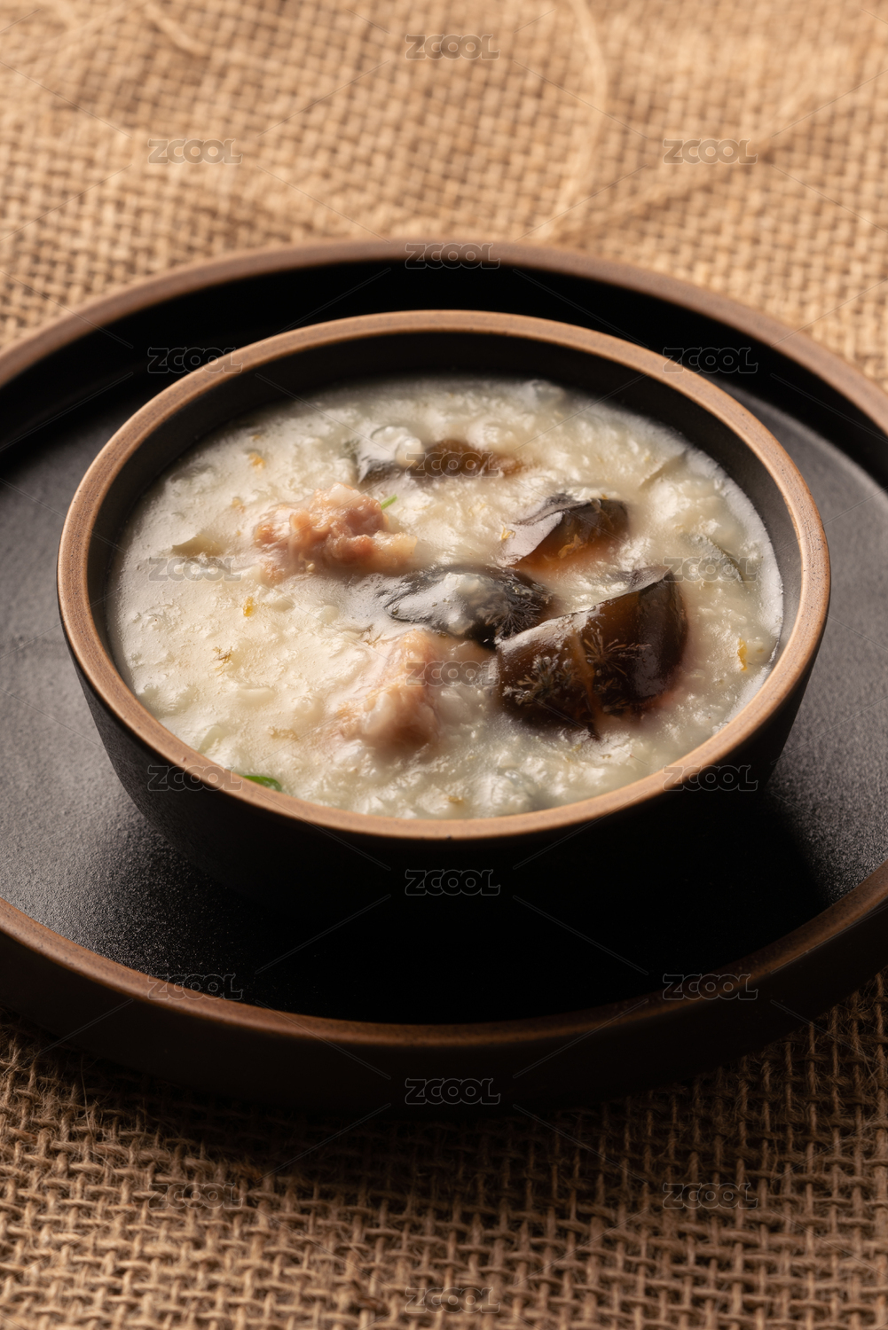 粗麻布上的托盘,和托盘上的皮蛋瘦肉粥