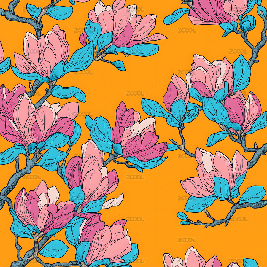 水彩玉兰花和樱花,绿色叶子图案,深蓝