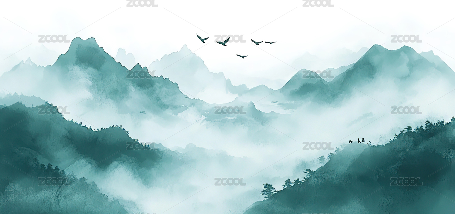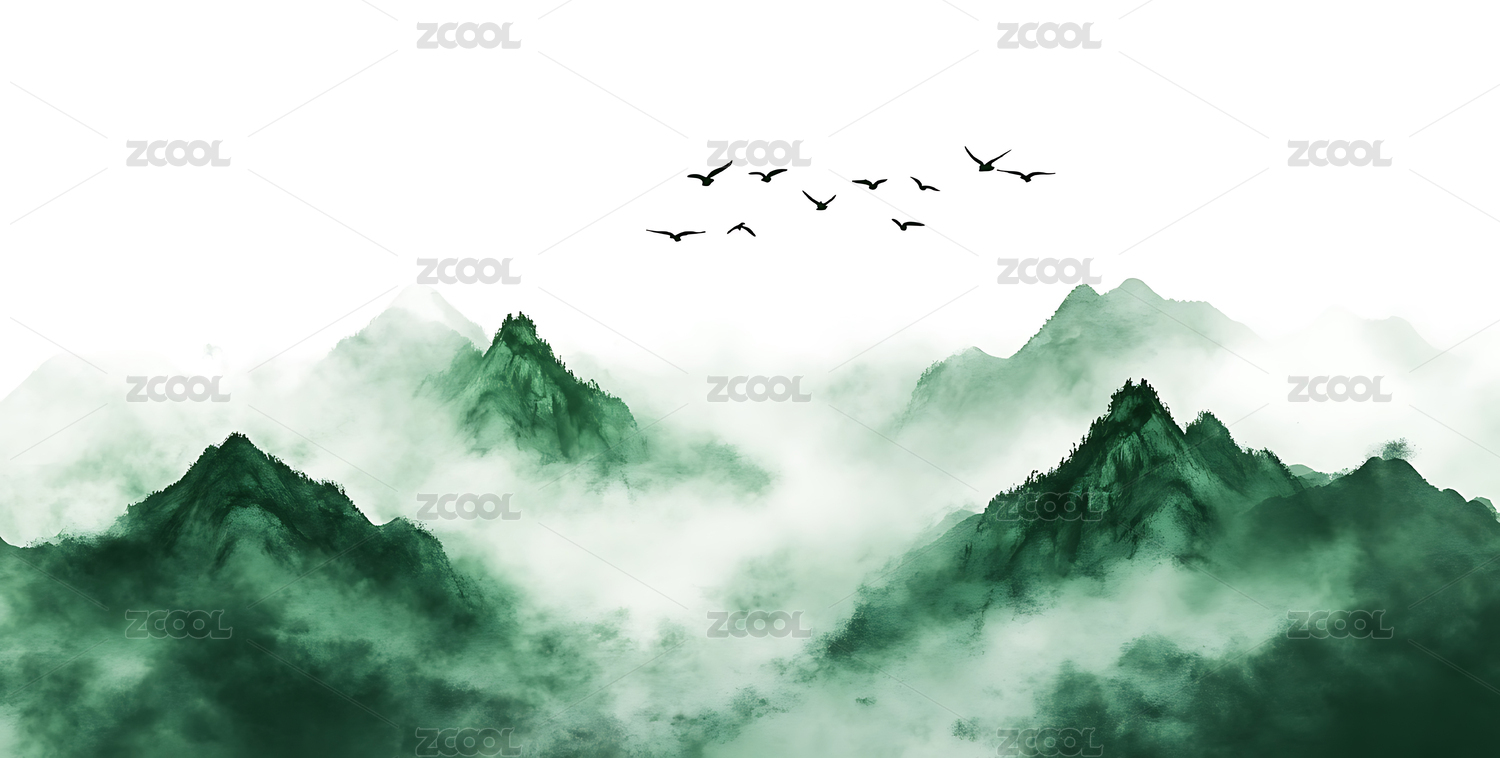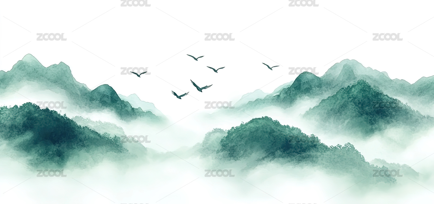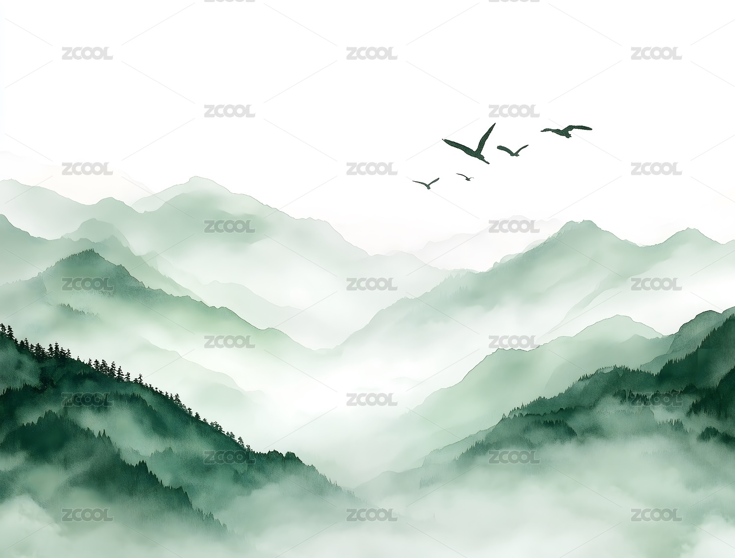 自然, 艺术, 绿色, 写意, 山脉, 装饰画, 背景图, 飞鸟, 水彩画, 意境
