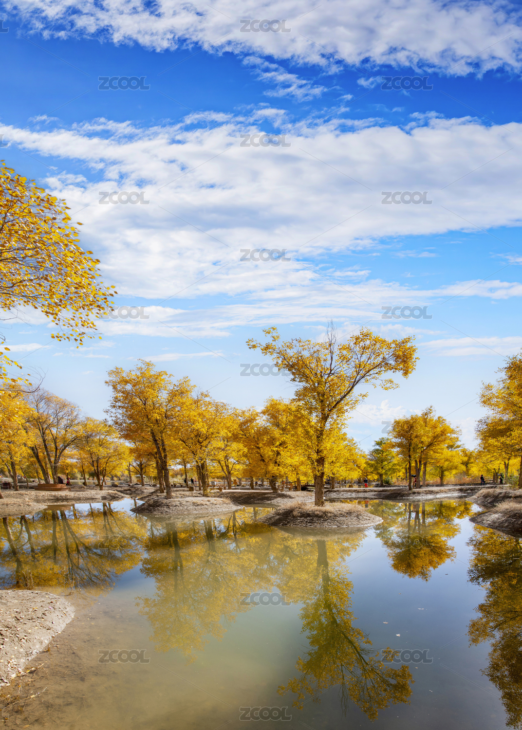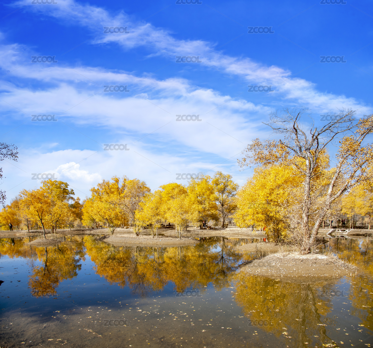 中国酒泉金塔秋天胡杨林蓝天白云水面光影