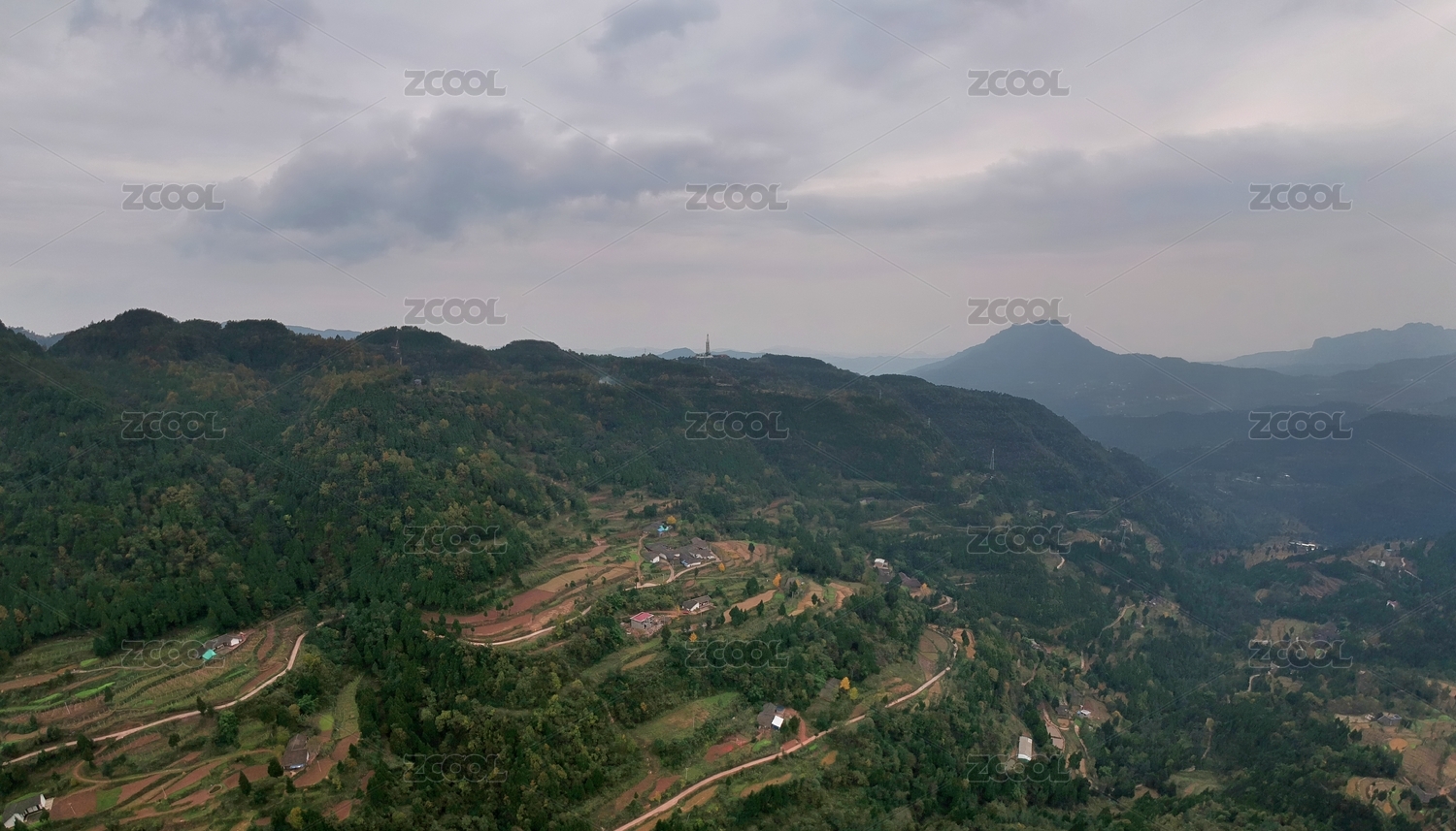 重庆云龟山山间晨雾下的青山连绵与村庄、道