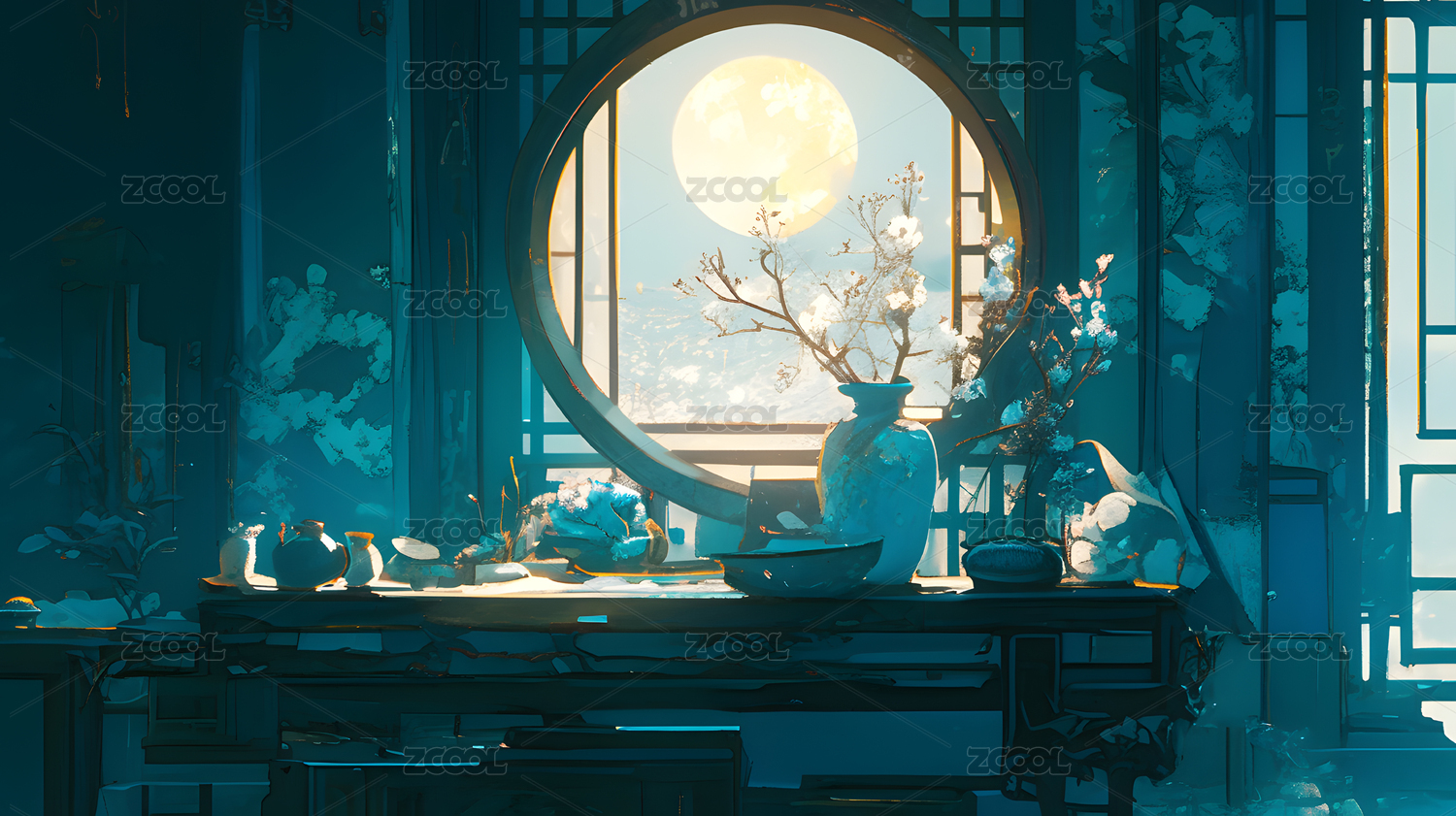 AIGCFG,中式,中国风,国潮风,插画,卡通,中秋节,节日,月亮,空间