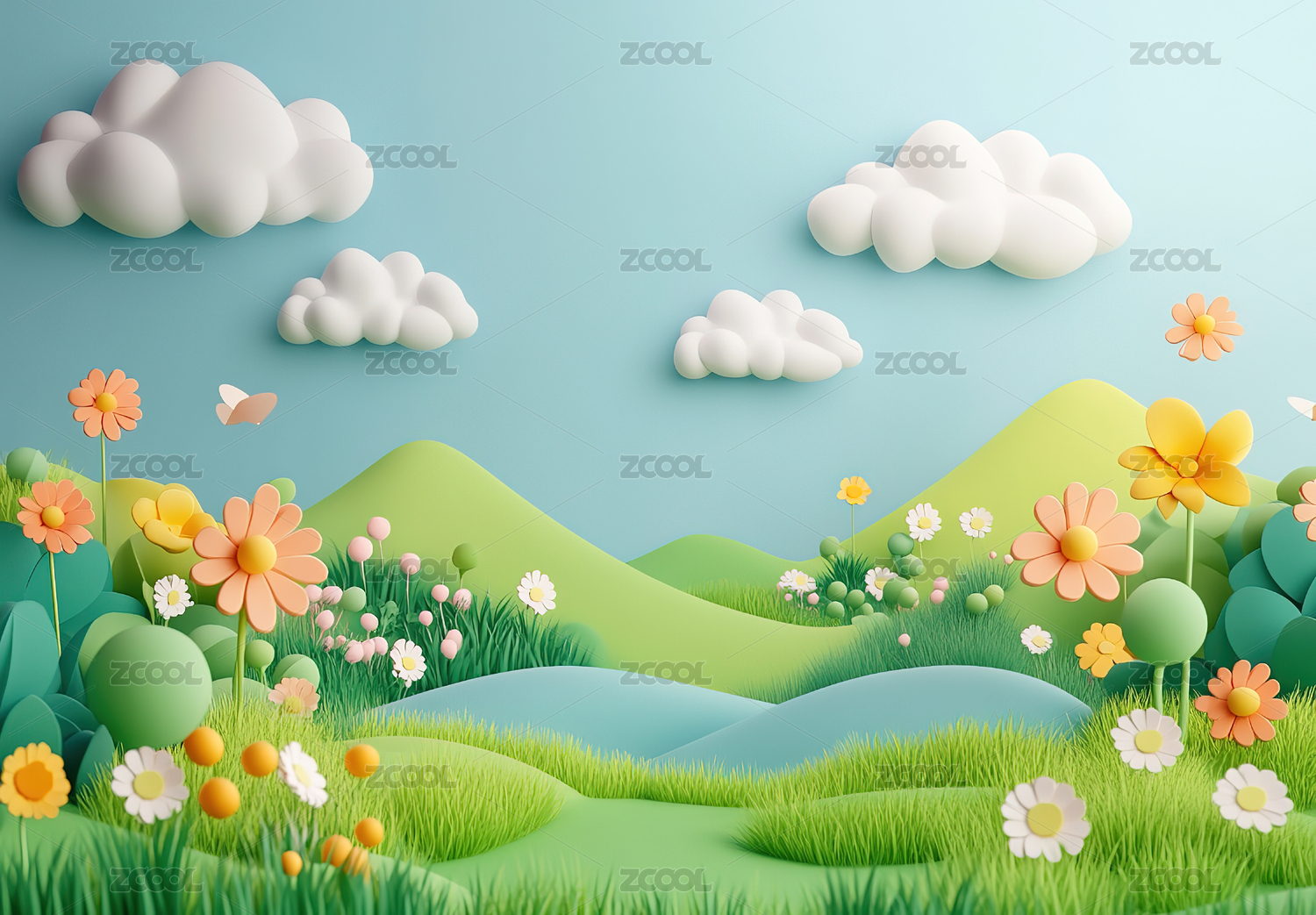 3D卡通春天草地可爱粉色花朵三维自然背景
