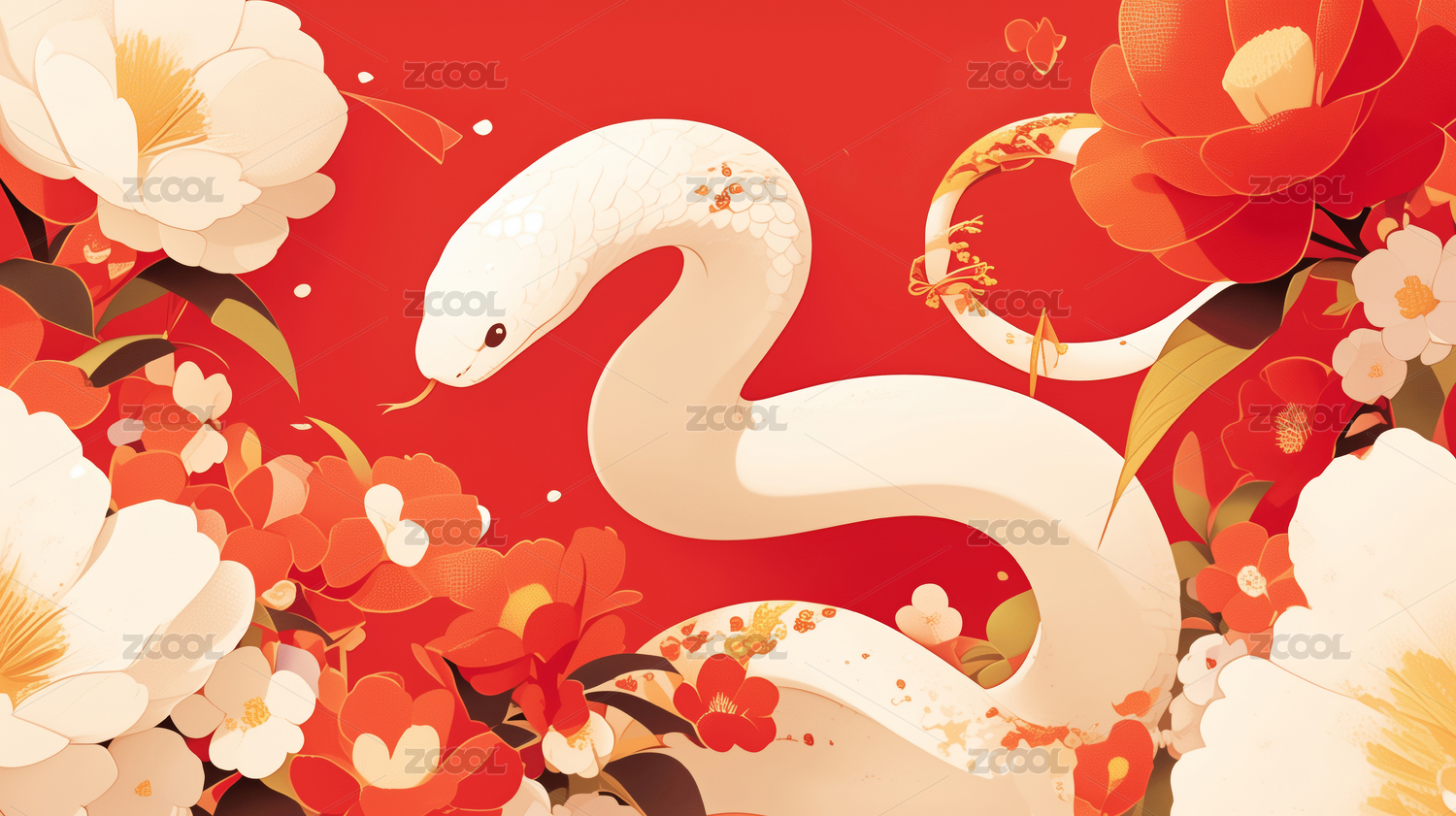 红色喜庆背景上的白色小蛇