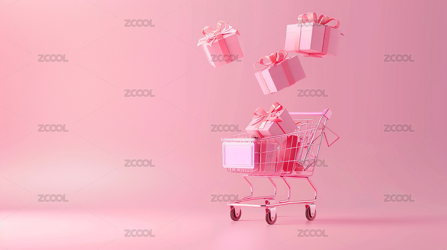 粉红色背景下的气球和购物车特写镜头