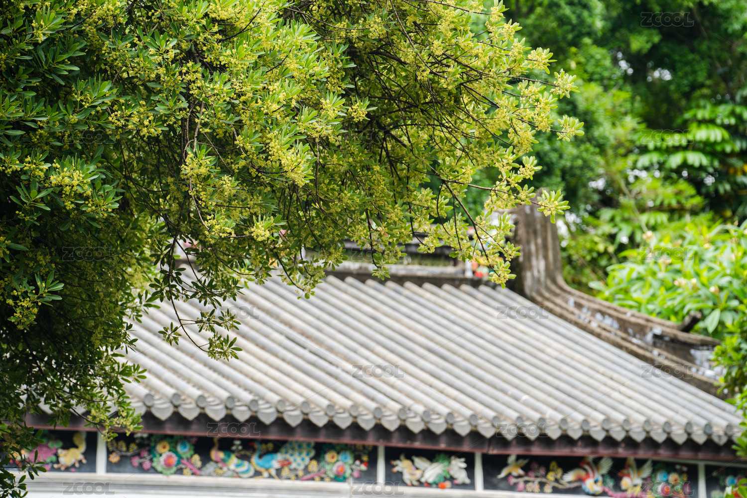 中国山东青岛即墨古城梧桐树叶下的寺庙屋顶