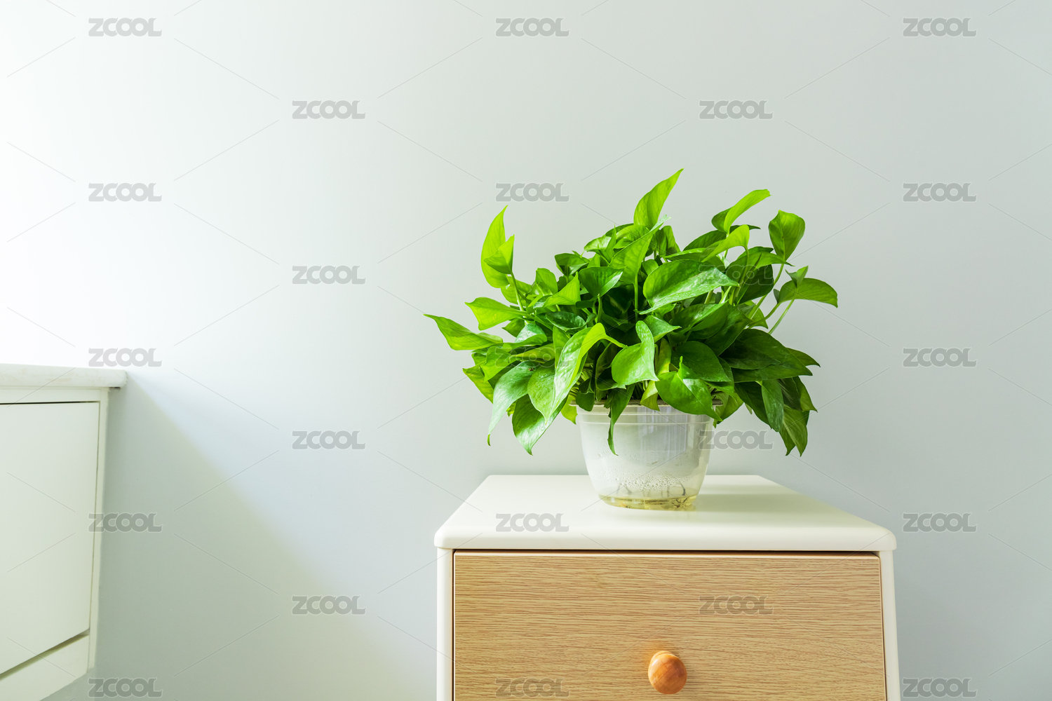 卧室床头柜上的绿萝植物