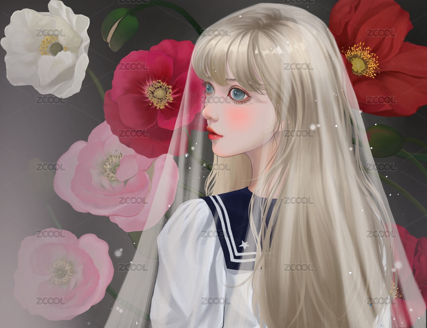 虞美人花丛和戴白纱的金发水手服少女