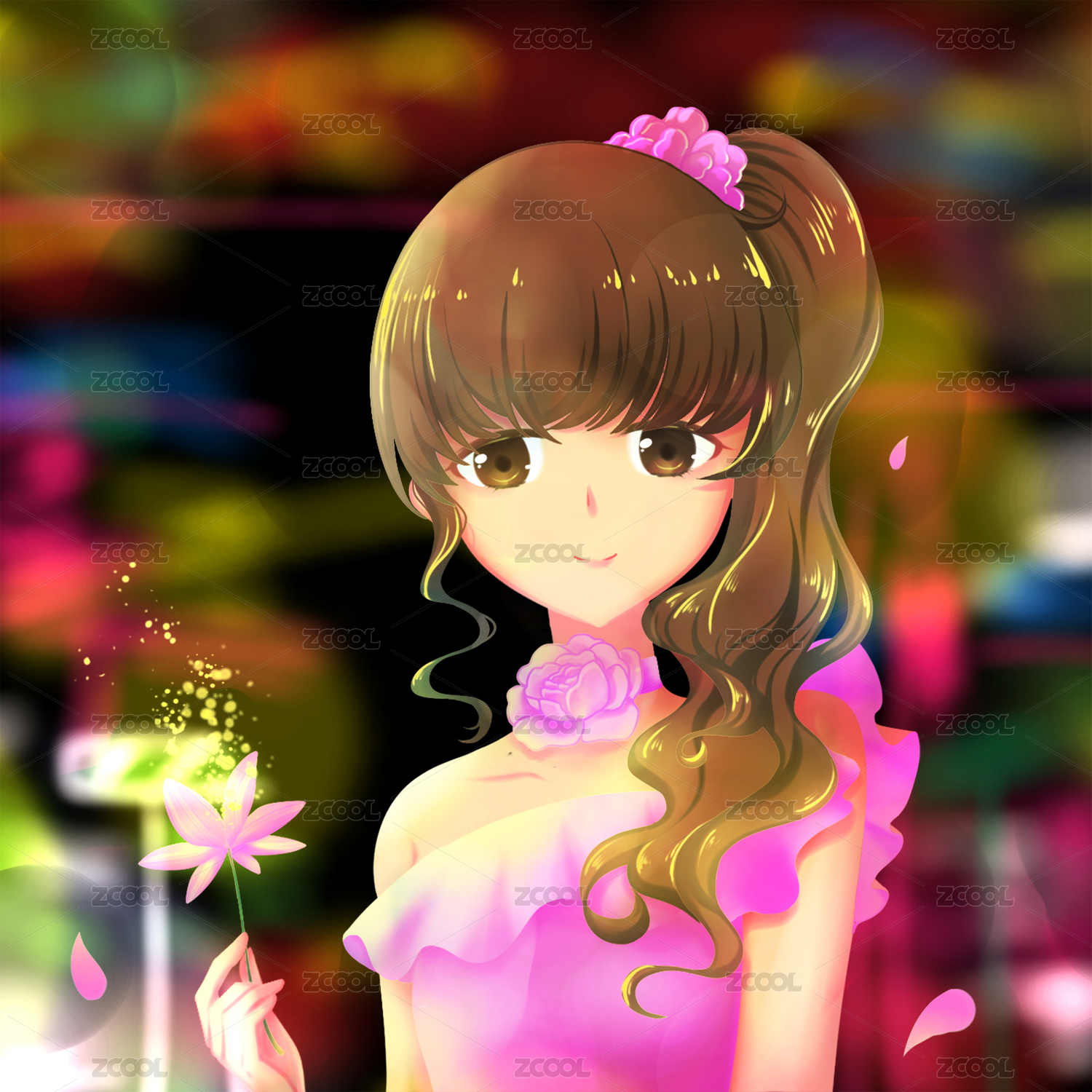 灯火阑珊下的粉色二次元少女,唯美卡通插画