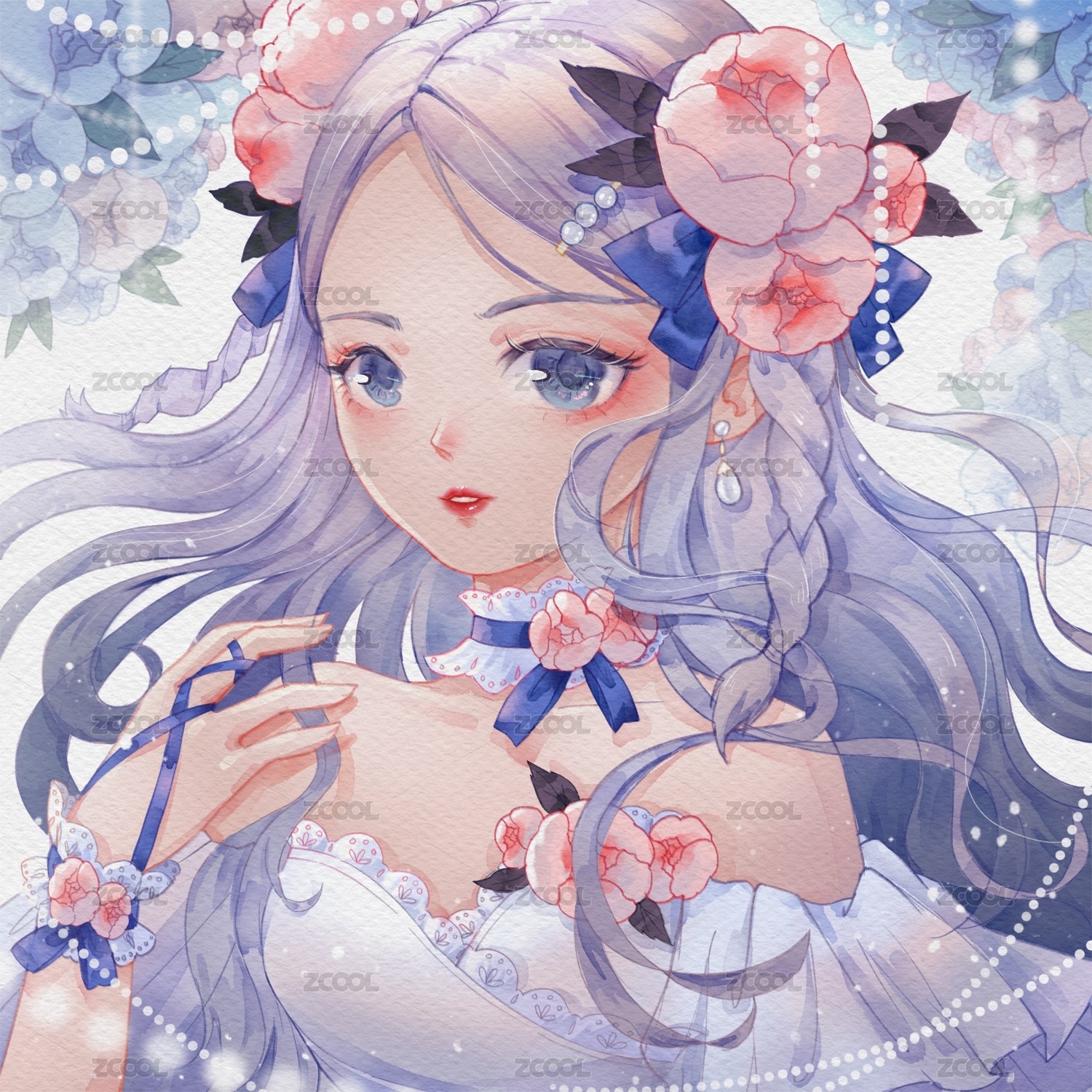 水彩风鲜花礼服长发少女