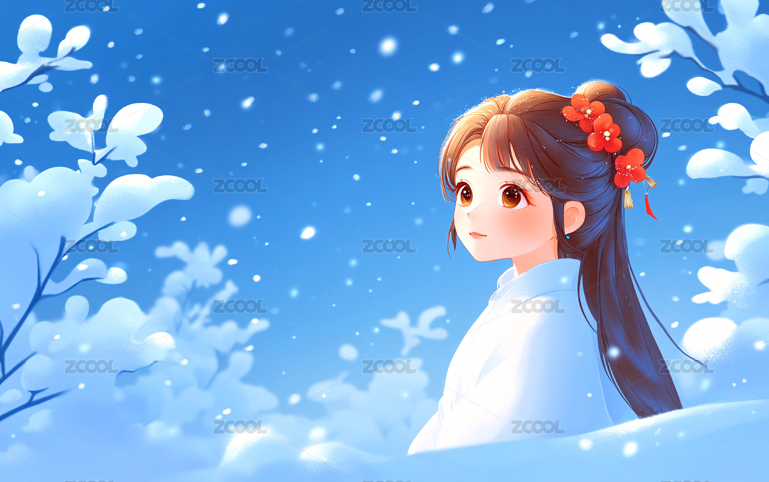 少女欣赏冬季梅花盛开的美景,蓝色粉色唯美卡通小清新冬天节气插画