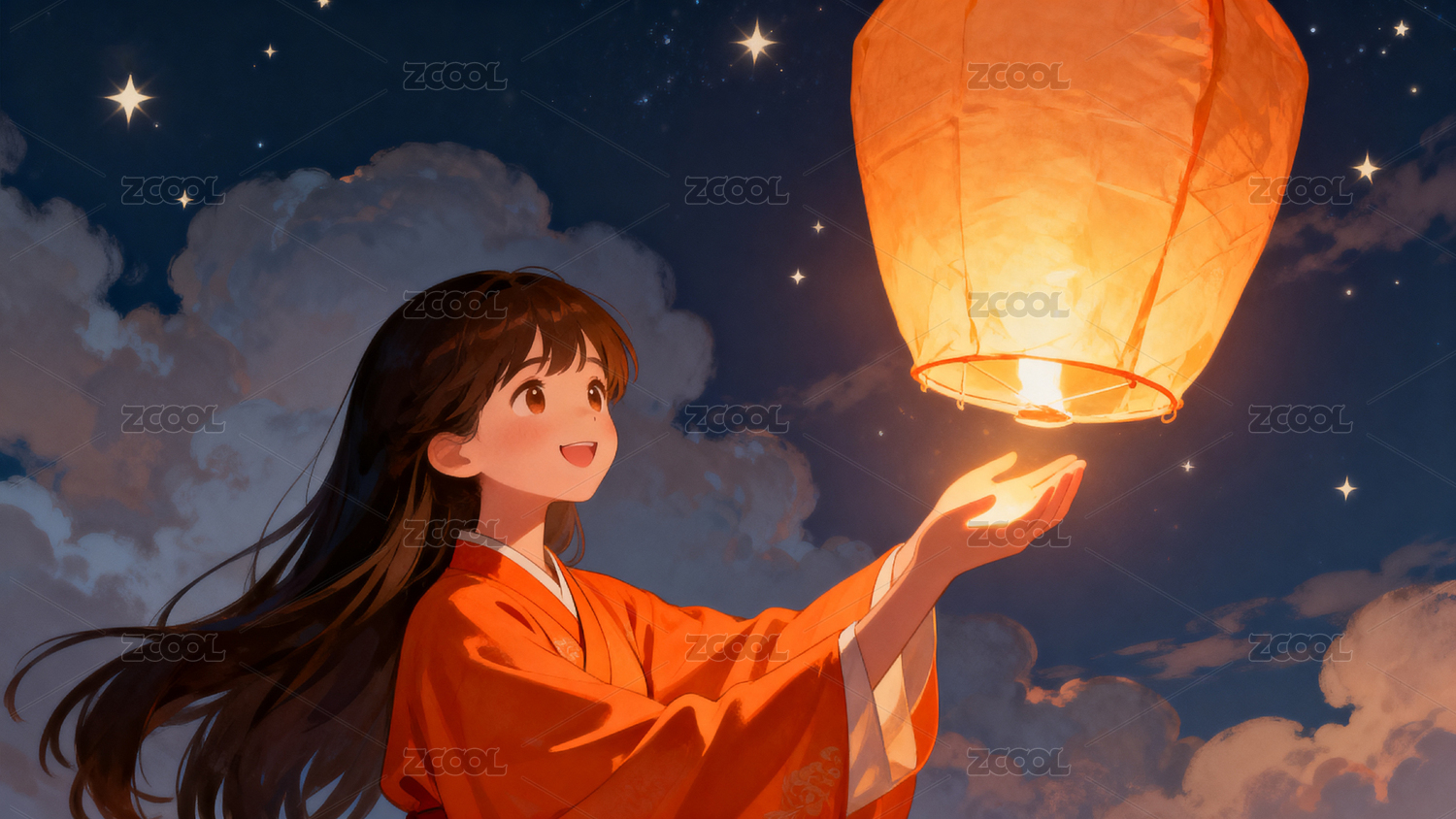夜空灯笼少女许愿