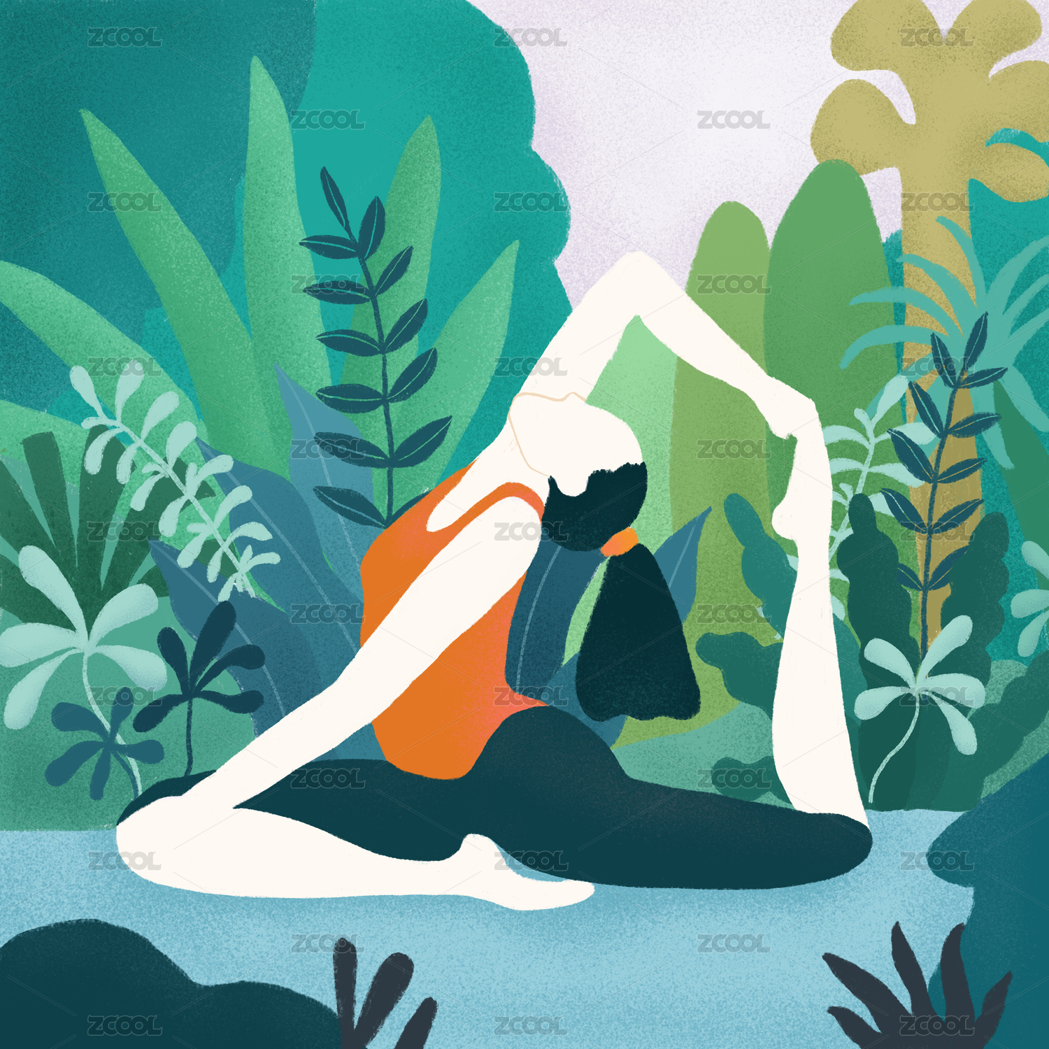 美丽的年轻女孩在户外森林练习瑜伽健身插画