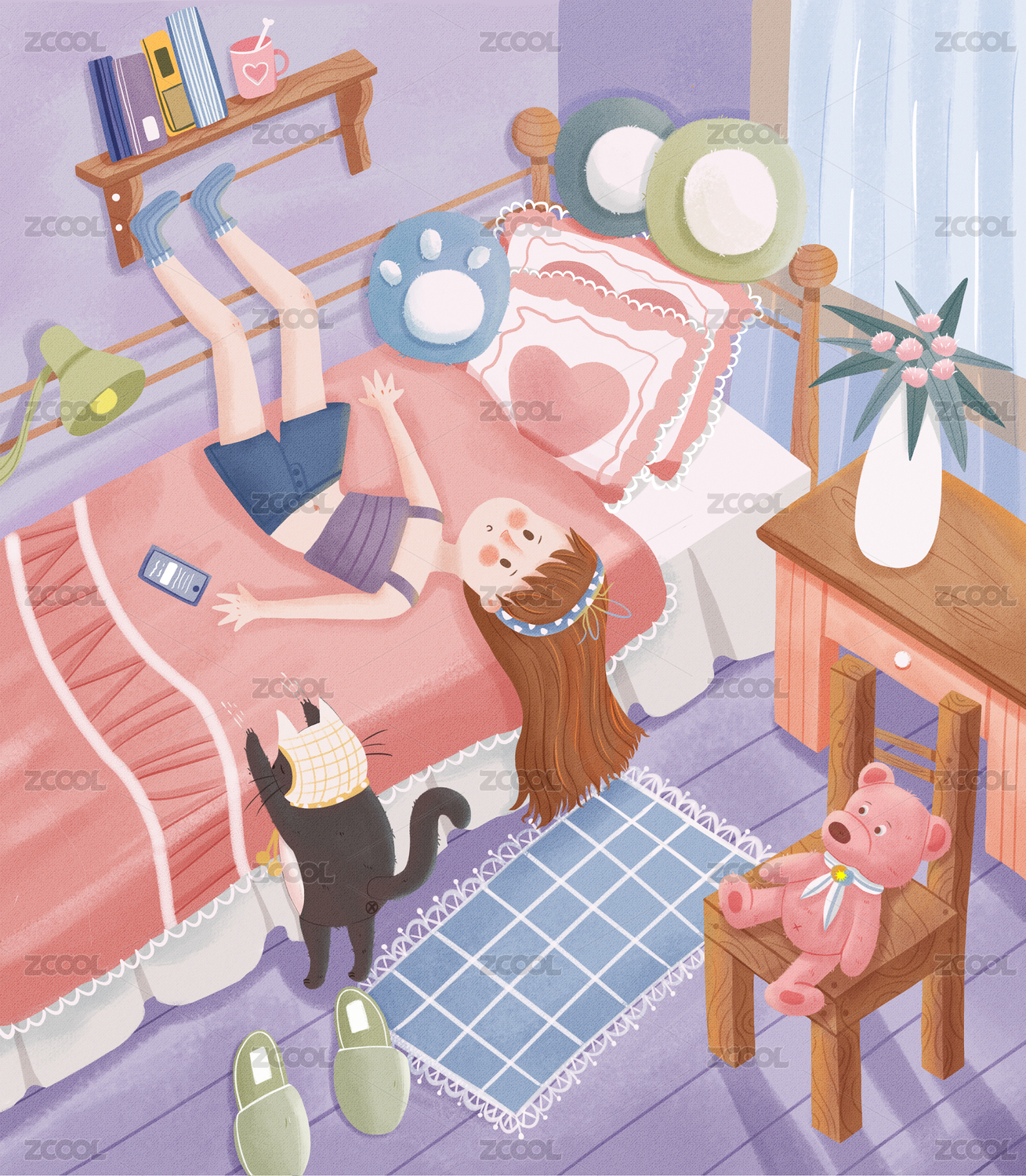 女孩沙发看书温馨日系插画