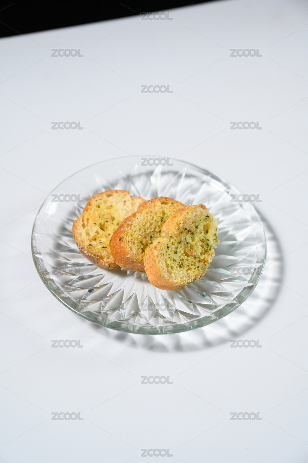 桌面上的盘子里的美味可口的蒜蓉法棍片
