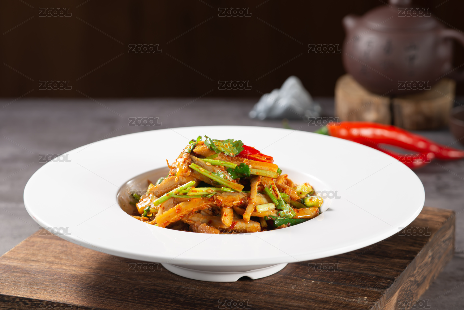 桌面上的盘子里的美味可口的凉拌秀珍菇