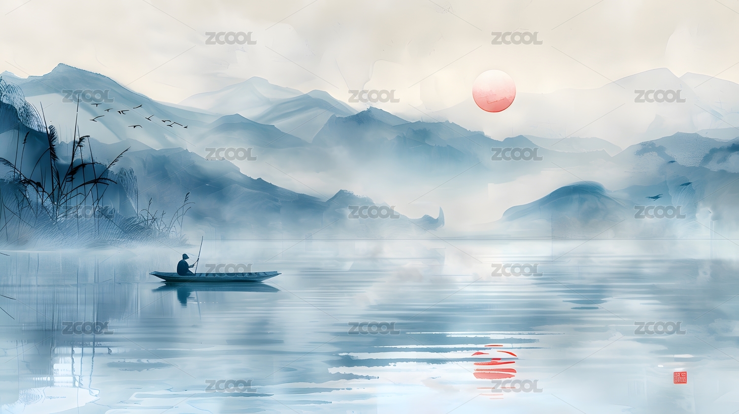 山水日出小舟剪影水墨意境