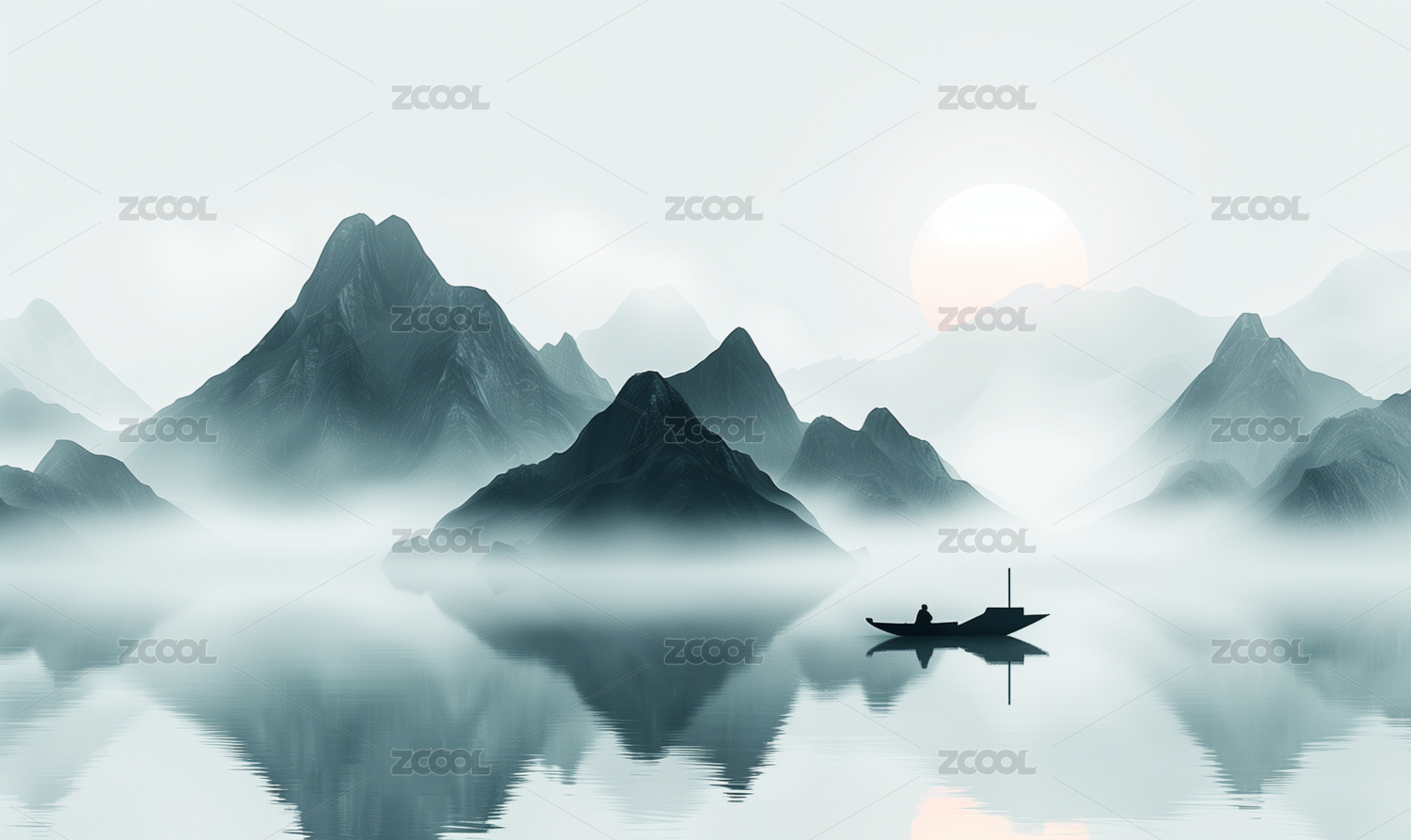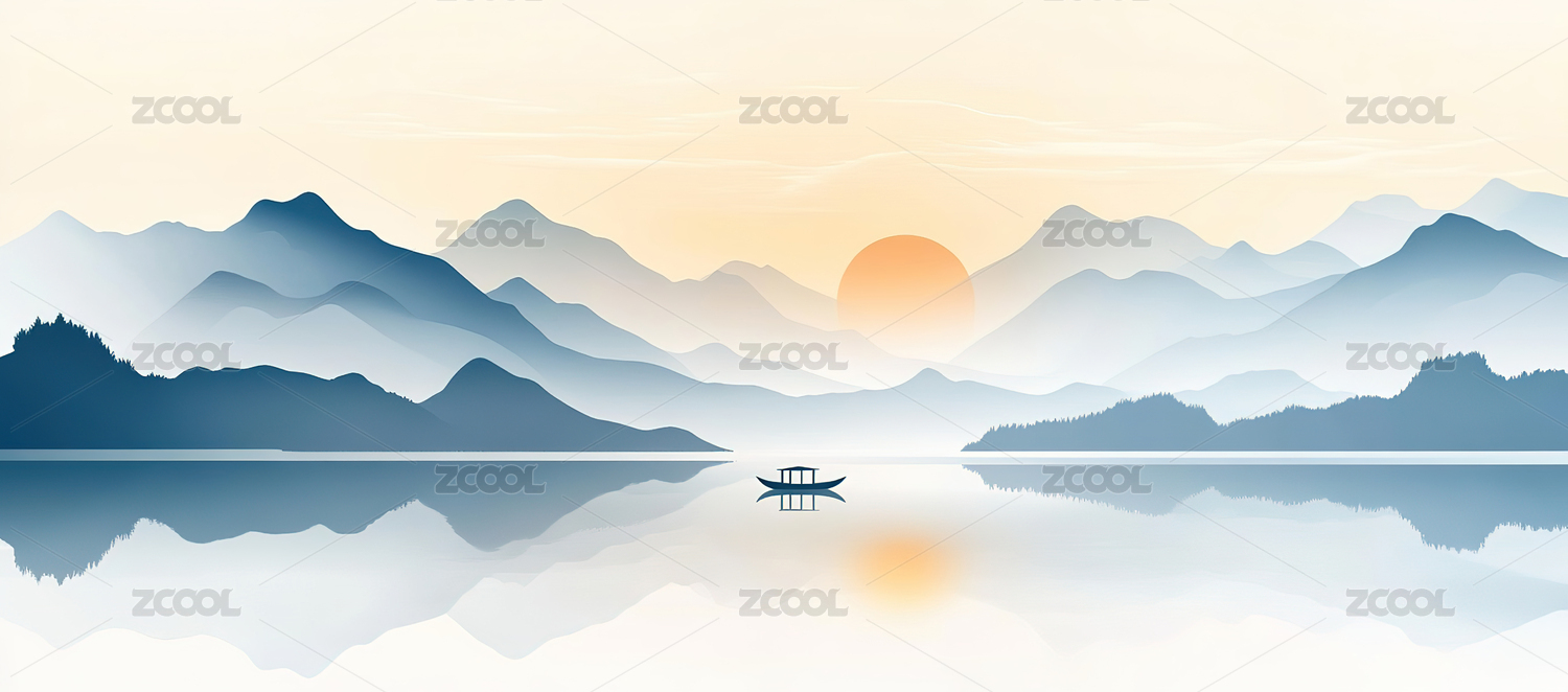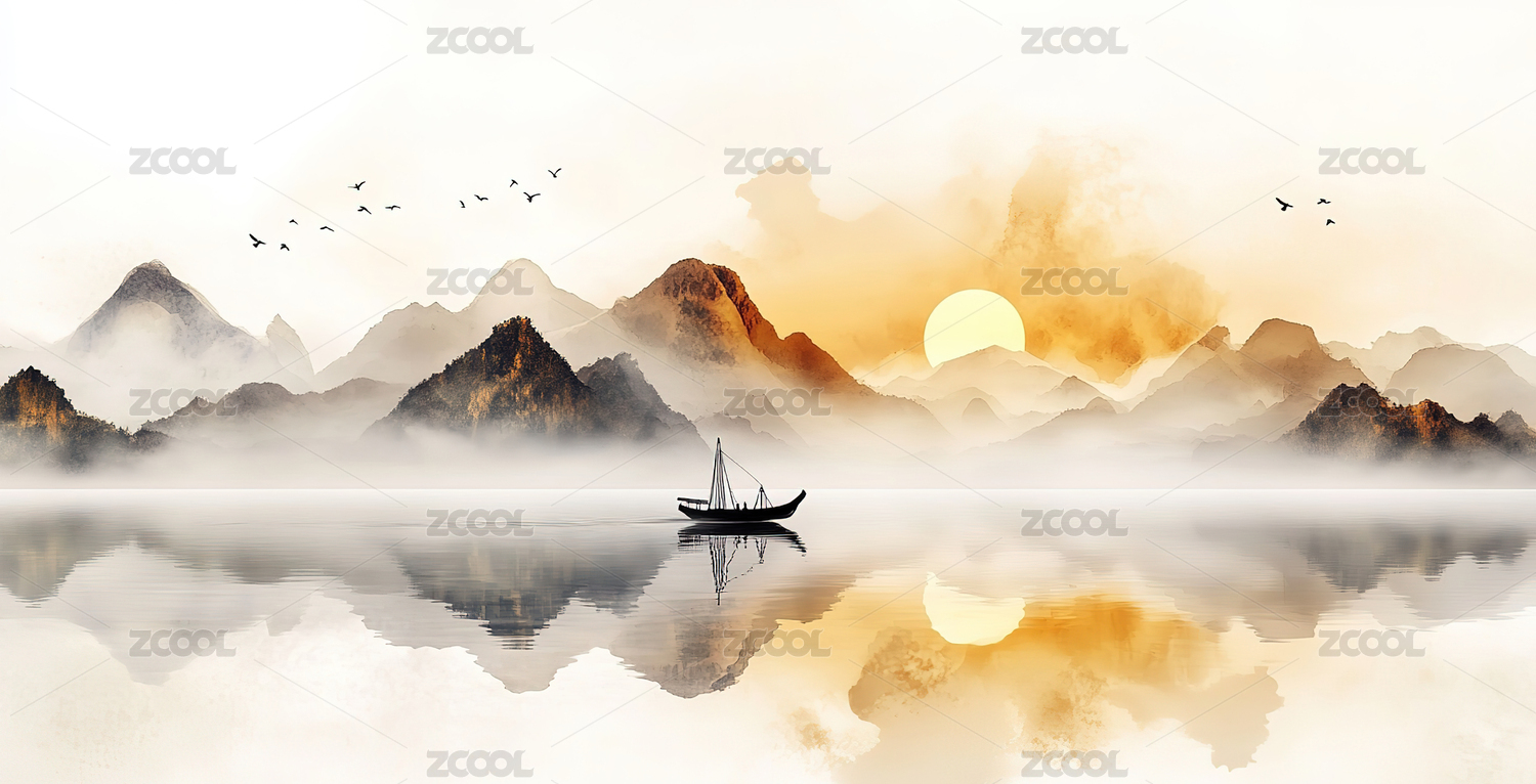 艺术,唯美,意境,水墨,山水,日出,风景,小舟,剪影,湖面