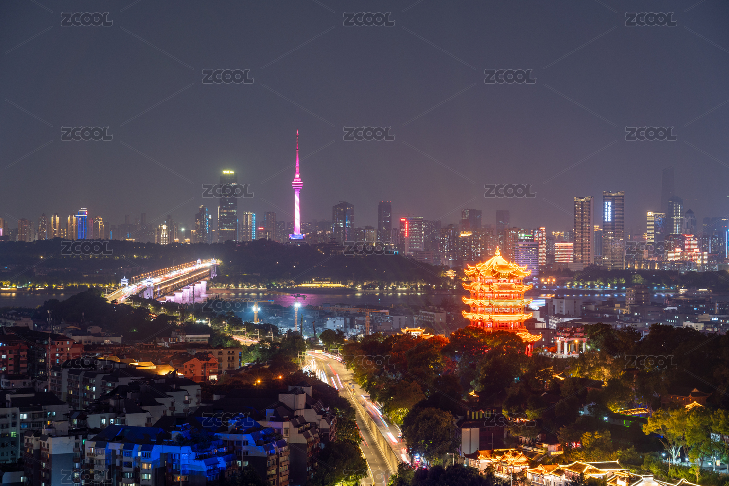 灯光璀璨的黄鹤楼和中国湖北武汉长江大桥夜景
