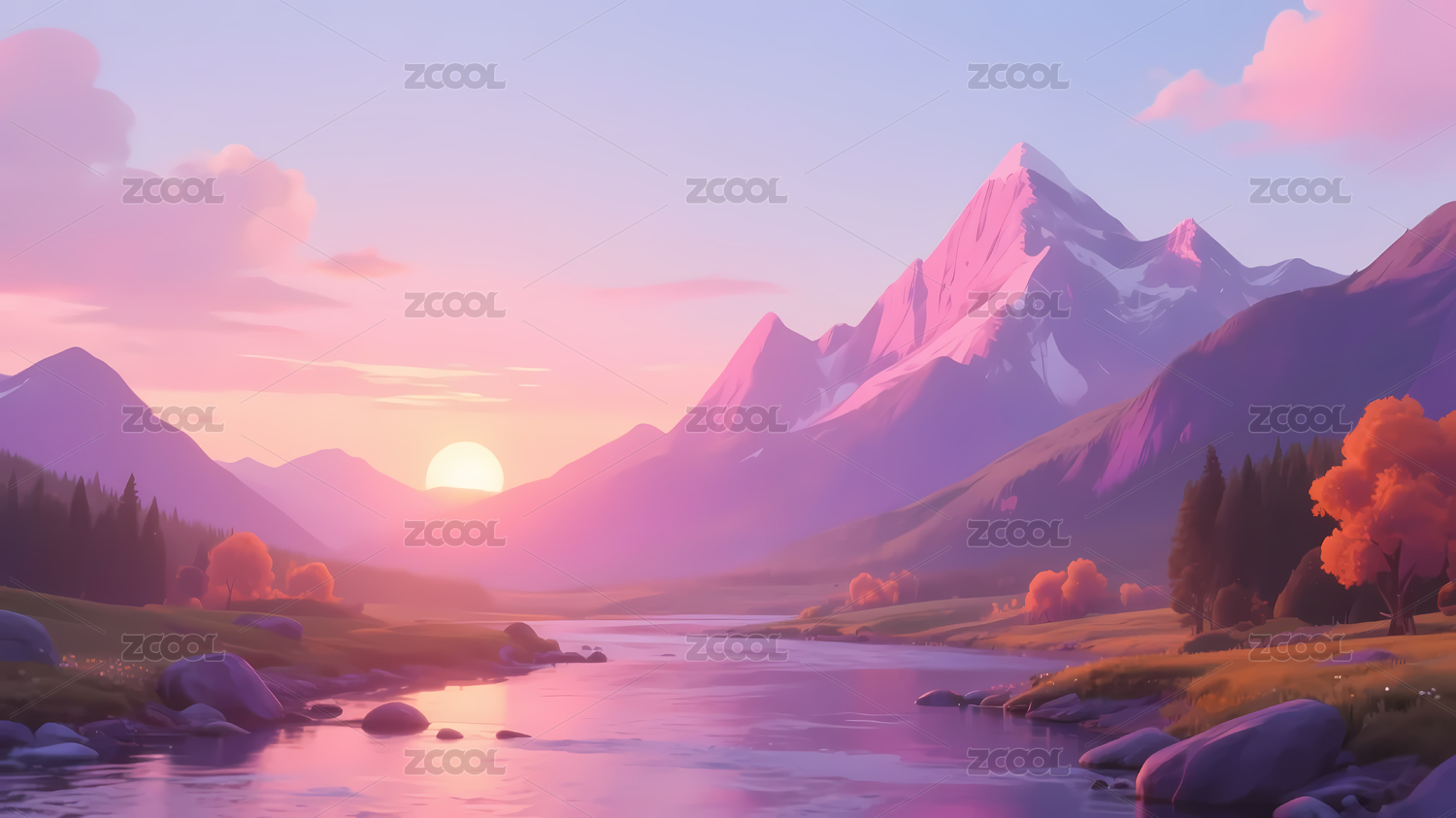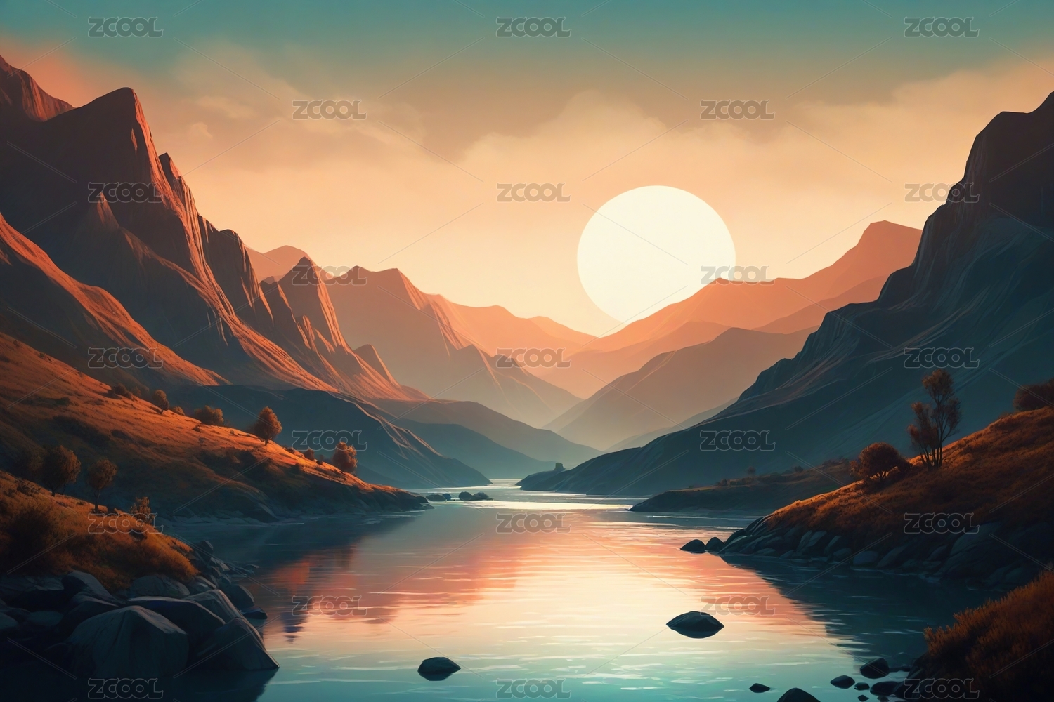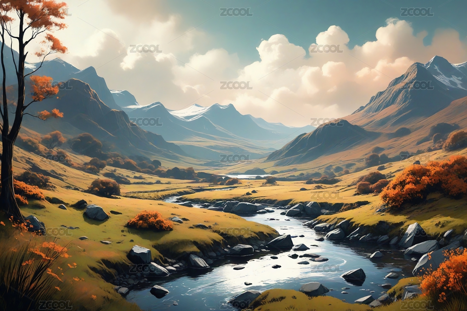 蜿蜒的溪流穿过山谷消失在远方水彩插画