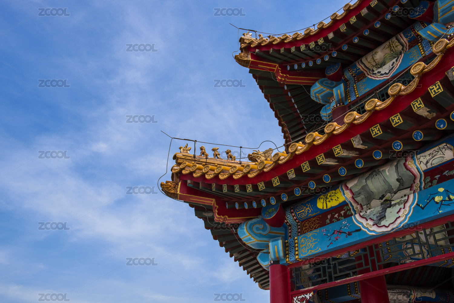 蓝天白云下的北京颐和园西堤景明楼屋檐