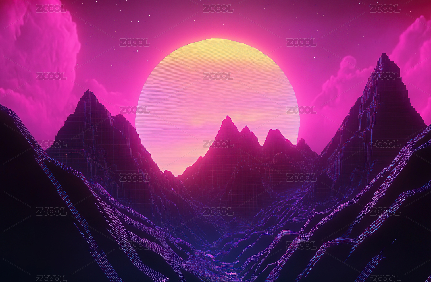 紫色夕阳山峰天空复古未来科技3D背景