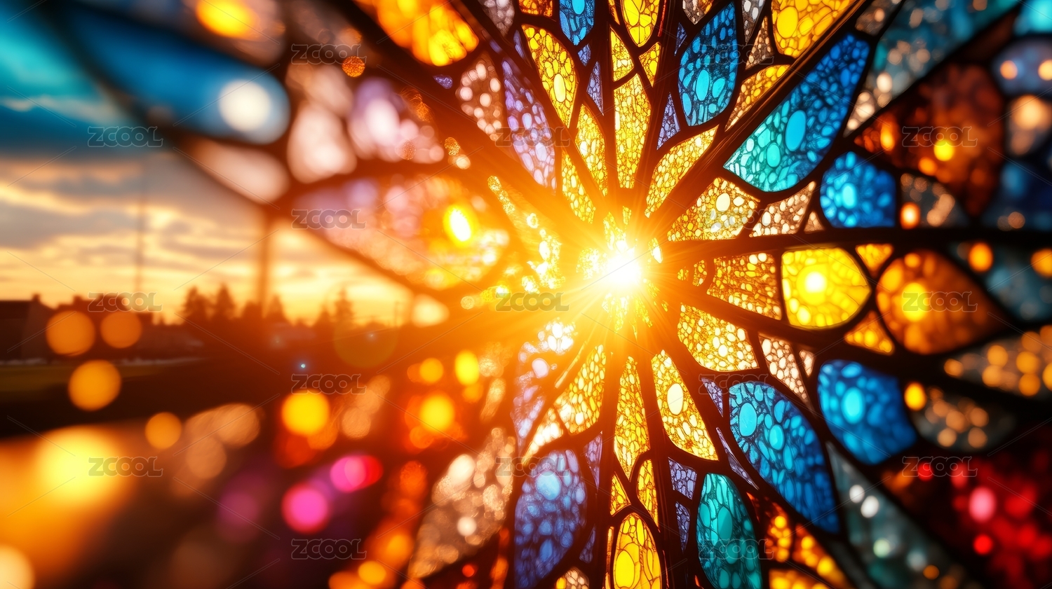 彩色玻璃窗夕阳景色