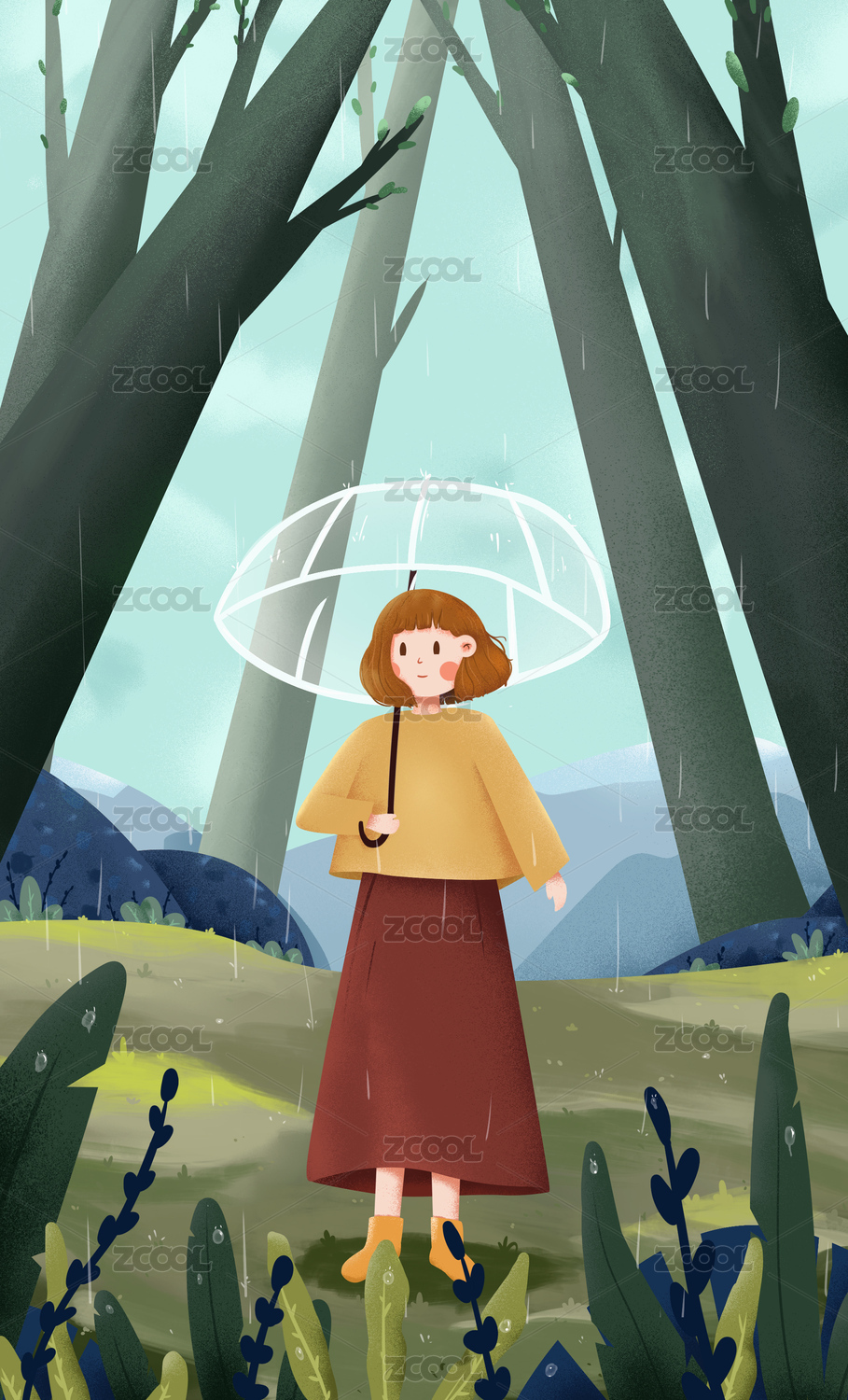 春天下雨春雨女孩打伞谷雨雨水节气插画