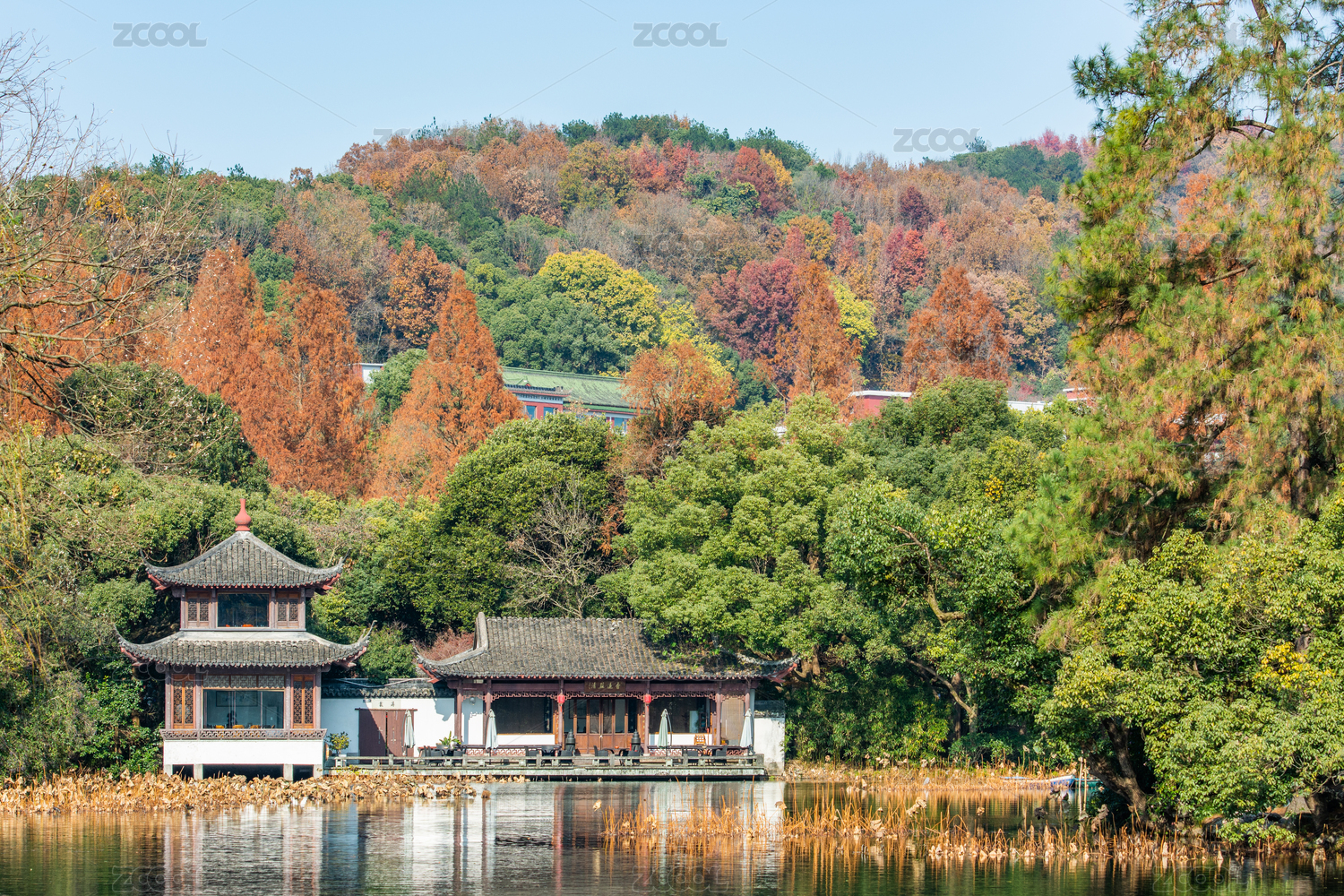 中国浙江杭州西湖畔浴鹄湾丛桂水阁