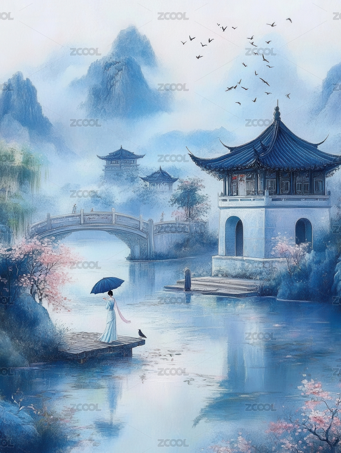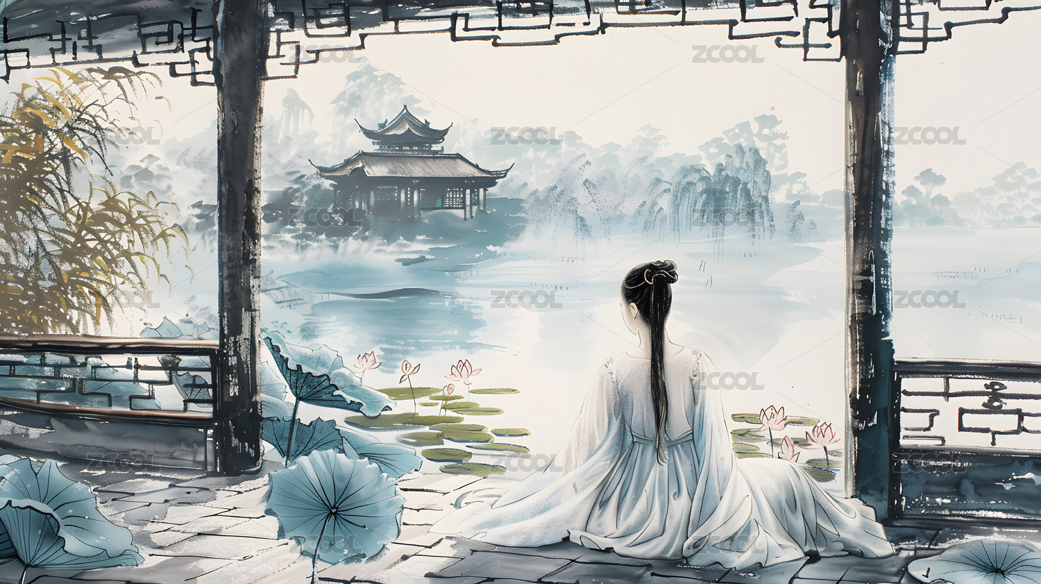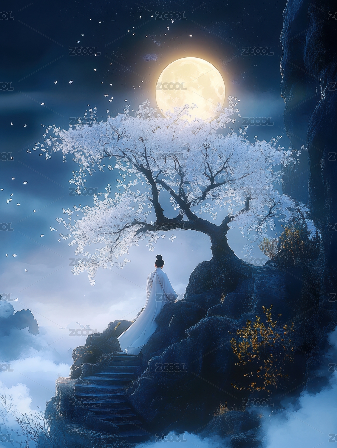 古风,山水,美女,背影,古建筑,夜晚,花,春天,树,倒影