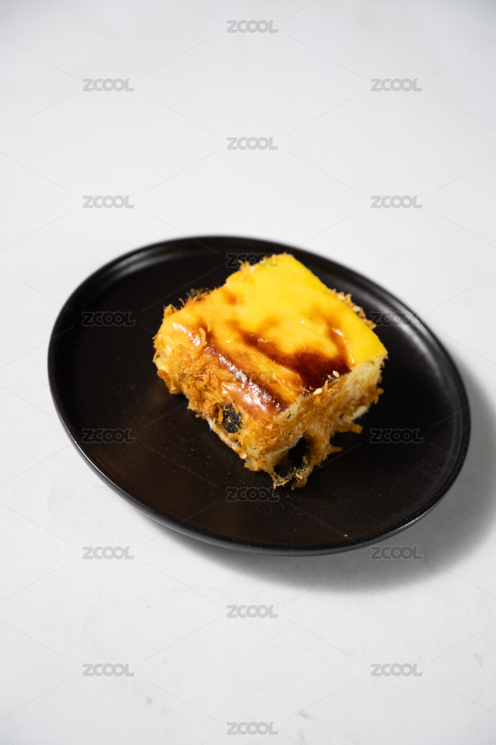 桌面上的盘子里的美味可口的芝士肉松蛋糕