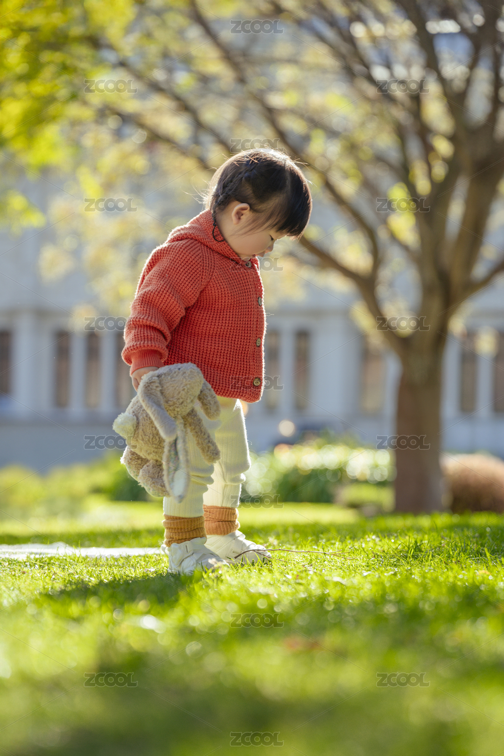 博物馆树前草坪上手拿布偶玩乐的可爱小女孩