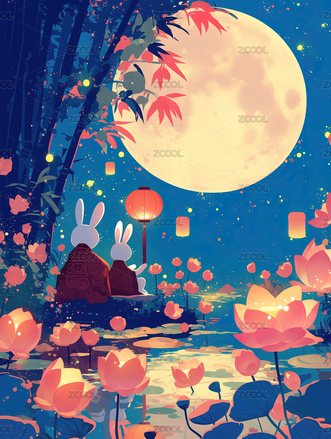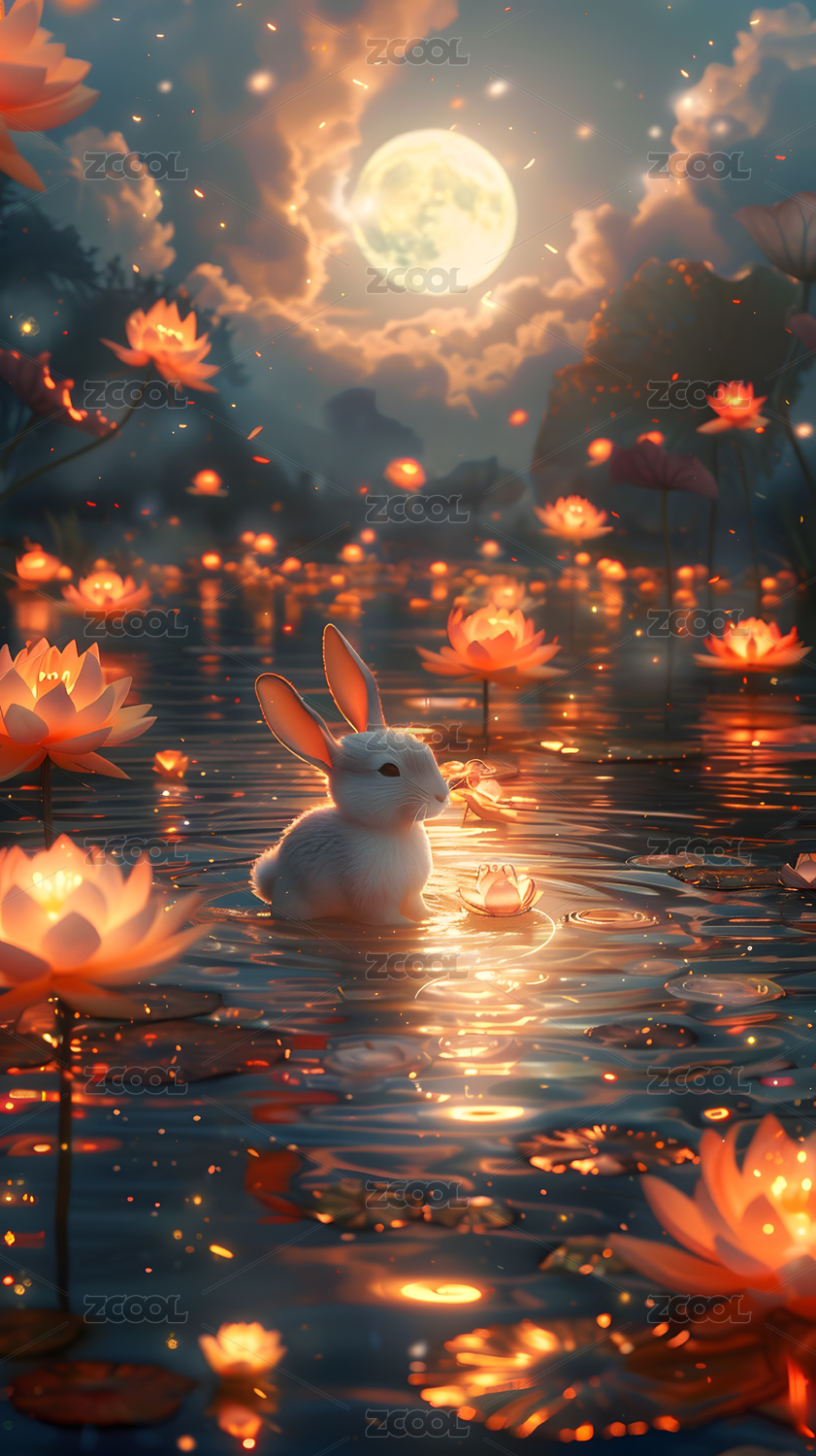 中秋节,兔子,月亮,圆月,赏月,灯笼,荷花池,荷花,池塘,倒影