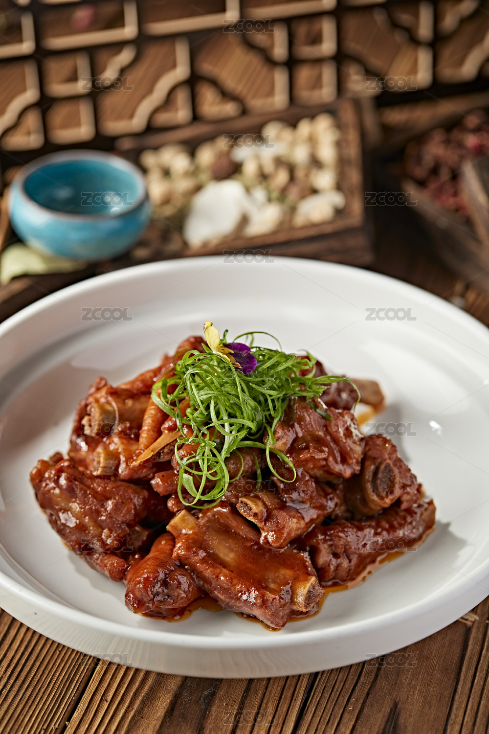 圆形白色瓷盘装的凉拌美味卤猪蹄