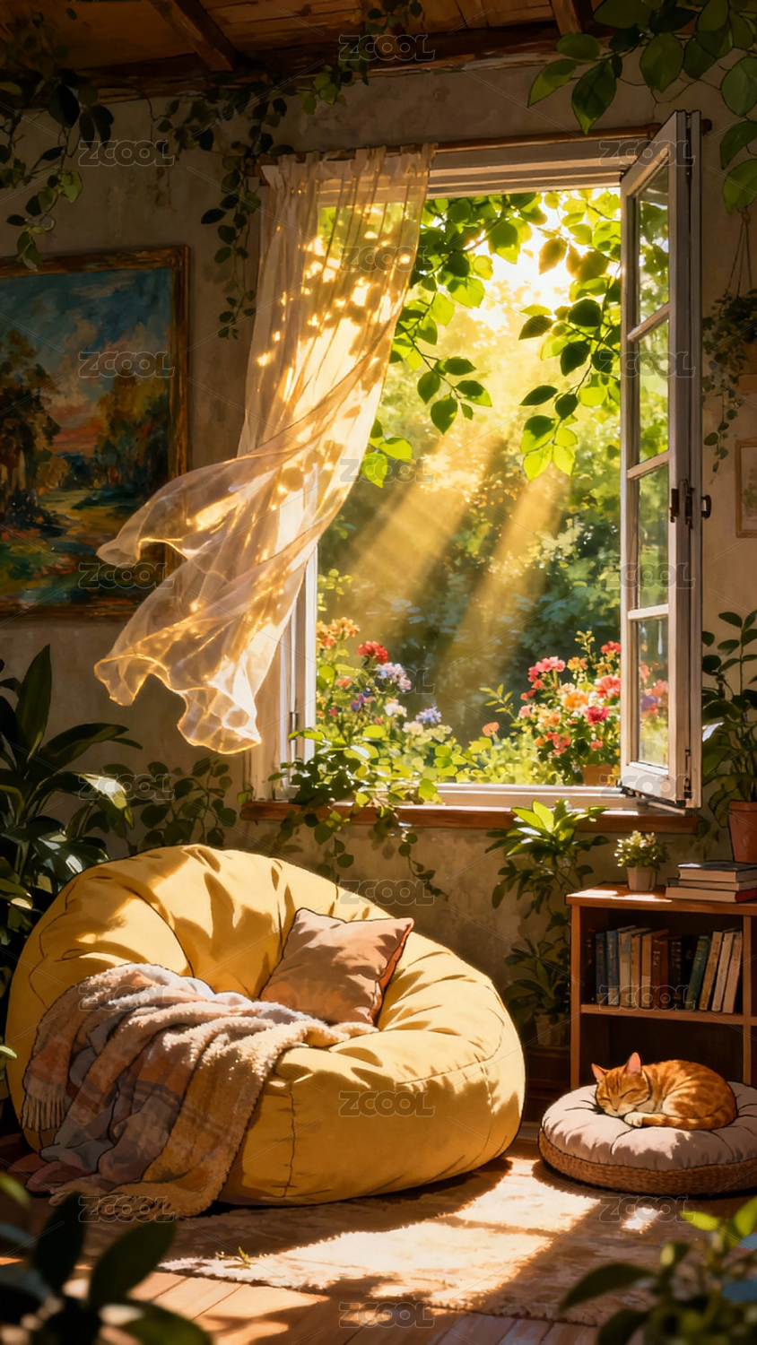 温馨室内一角拱形窗户透进自然光绿树成荫