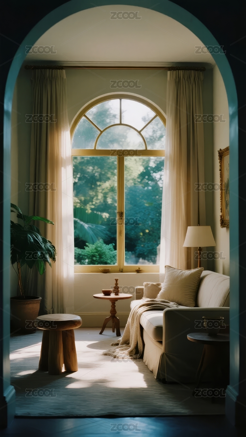 拱形窗边的温馨客厅阳光明媚绿树成荫