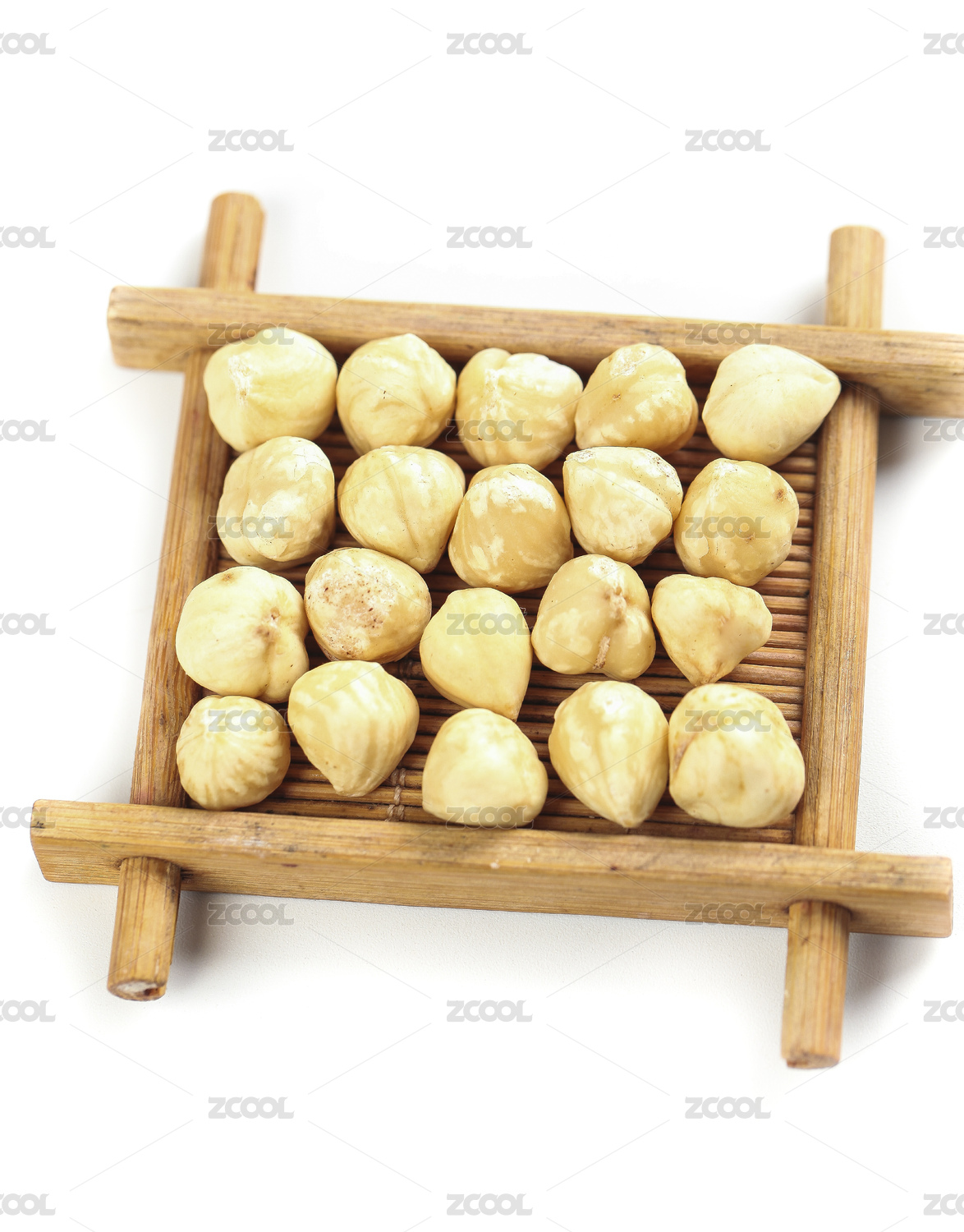 白底木垫上放着一堆无壳榛子仁